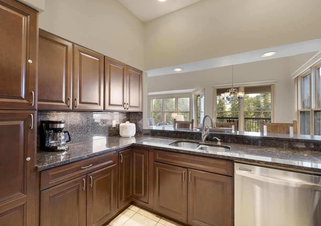 The home features three generously sized bedrooms and three full bathrooms, offering ample privacy and comfort for families or groups. The well-appointed kitchen is equipped with everything needed for a gourmet meal or casual après-ski bites, including an electric range, microwave, dishwasher, refrigerator, and ample counter space.