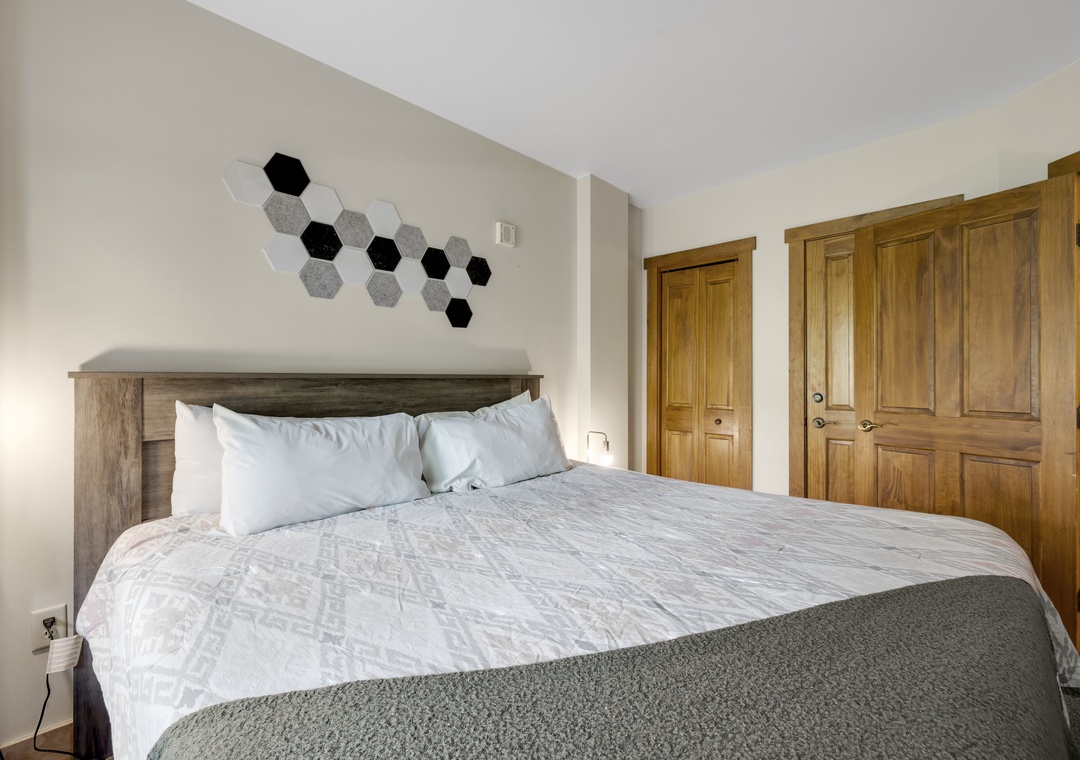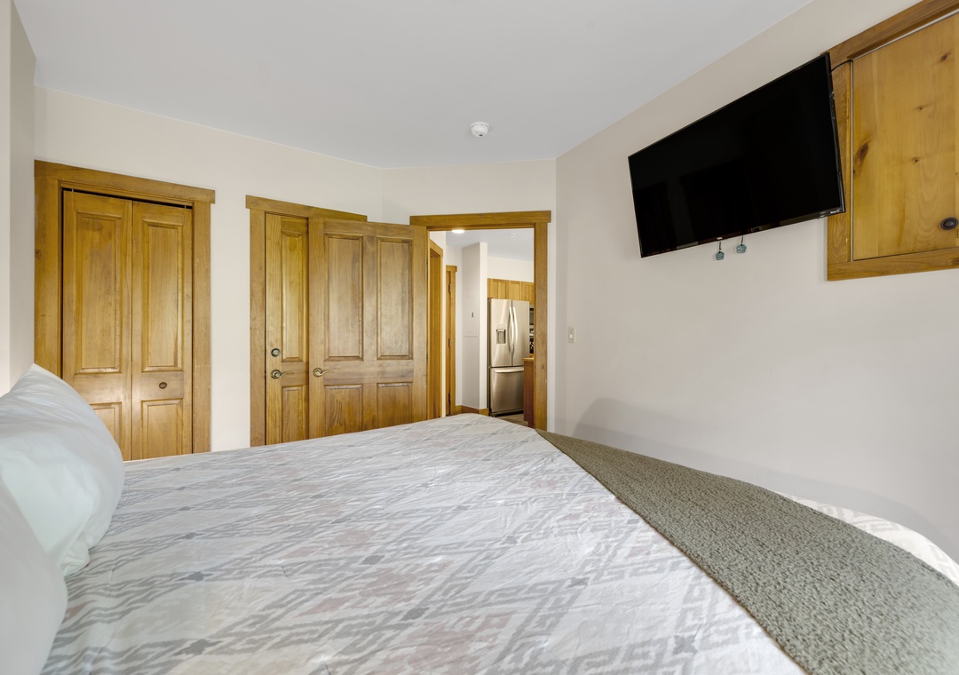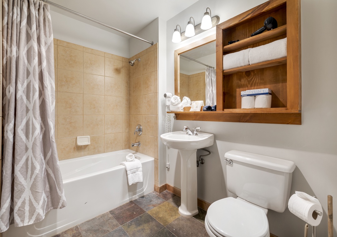 The bedroom offers a restful sanctuary, featuring a king-sized bed adorned with soft linens and plenty of storage for your gear. The bathroom is sleek and spacious, with a tub and shower combination perfect for soaking tired muscles after a day of skiing or hiking.
