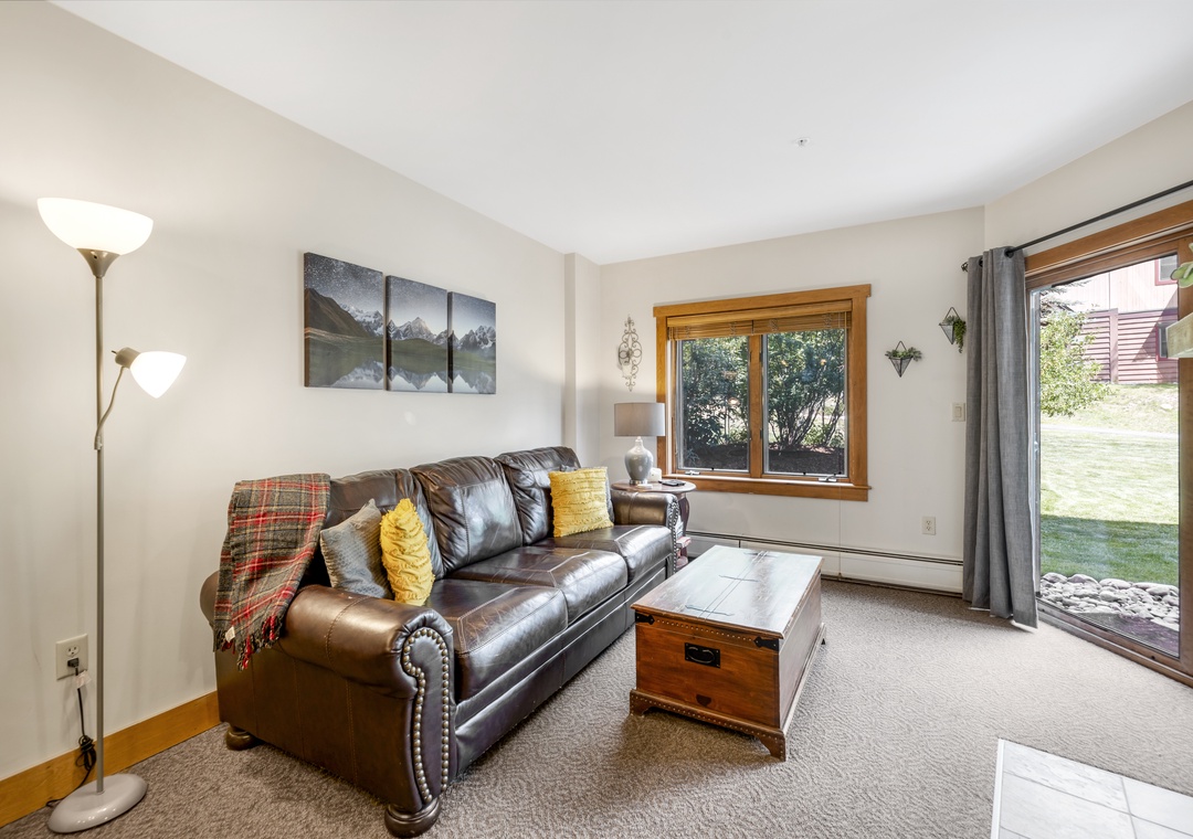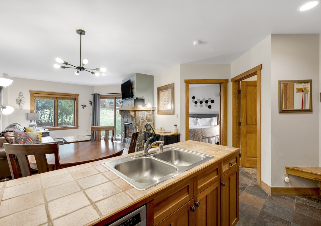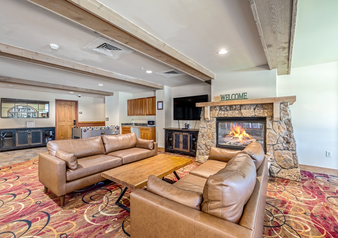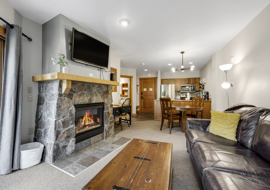Step inside and instantly feel at home in the warm, inviting living space. The condo features a cozy stone fireplace, rustic wood accents, and tasteful mountain décor that sets the tone for a relaxing stay. Large windows fill the space with natural light and offer picturesque views of the surrounding area. Sink into the plush sofa after a day on the slopes, or step out onto the private patio to enjoy a steaming cup of coffee as the sun rises over the mountains.