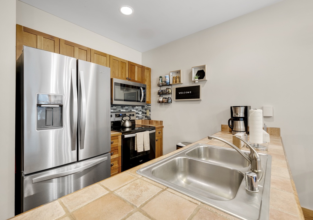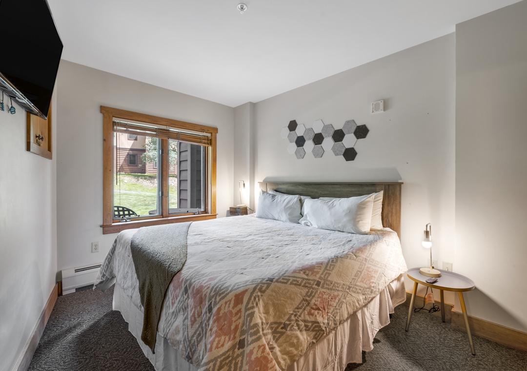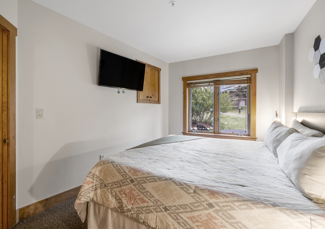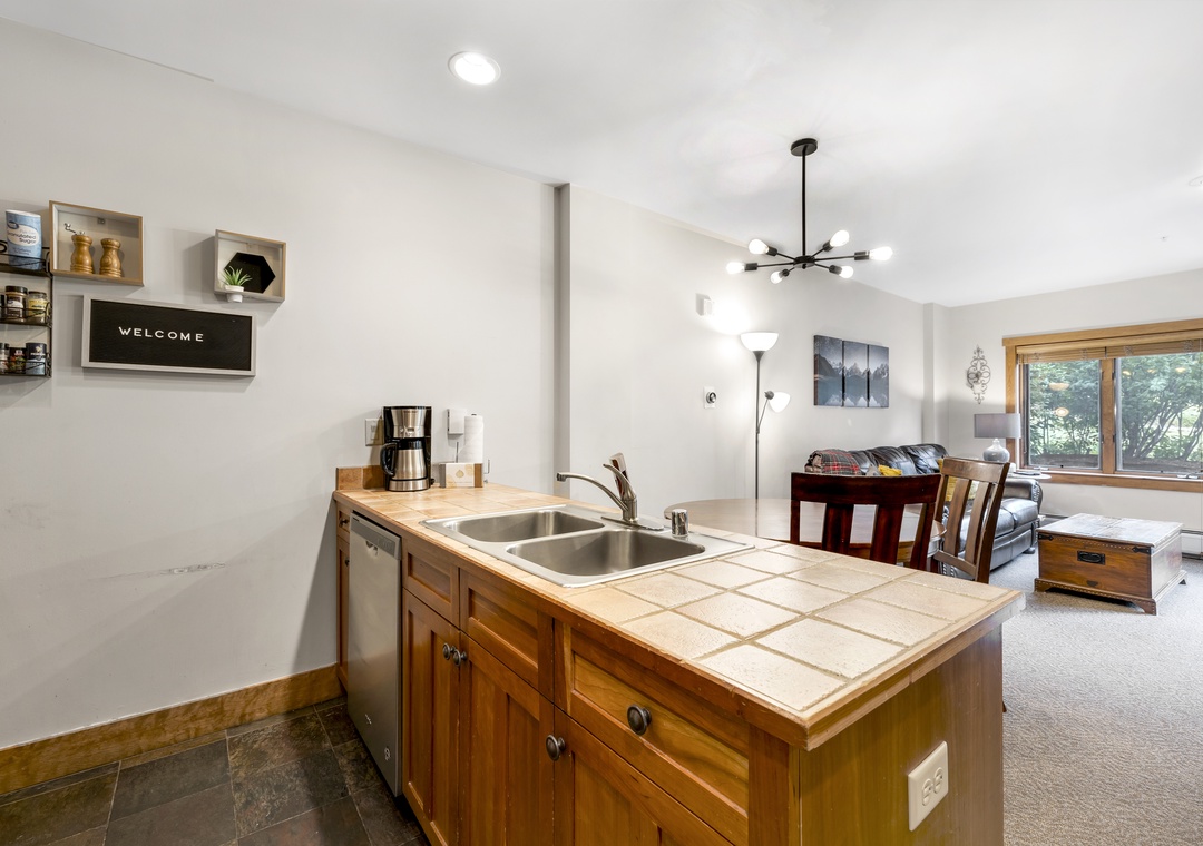 Step inside and instantly feel at home in the warm, inviting living space. The condo features a cozy stone fireplace, rustic wood accents, and tasteful mountain décor that sets the tone for a relaxing stay. Large windows fill the space with natural light and offer picturesque views of the surrounding area. Sink into the plush sofa after a day on the slopes, or step out onto the private patio to enjoy a steaming cup of coffee as the sun rises over the mountains.