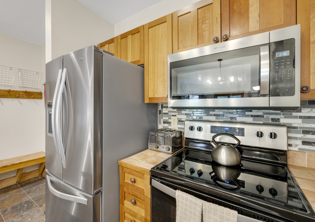 The fully equipped kitchen is ready for any culinary adventure, complete with stainless steel appliances, granite countertops, and all the essentials for preparing meals with family or friends. A charming dining area provides a comfortable spot to gather and enjoy everything from hearty breakfasts to après-ski dinners.
