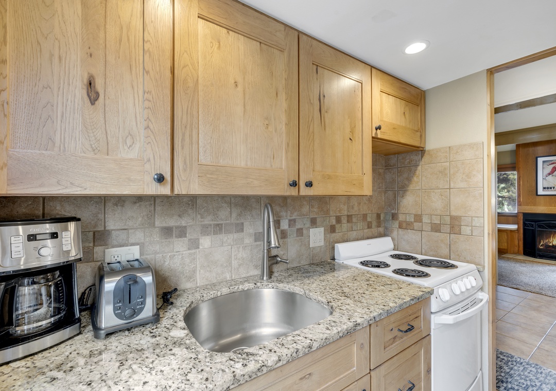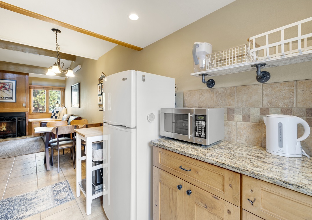 The fully equipped kitchen is perfect for whipping up a delicious meal or quick snack – coffee maker, water kettle, toaster, blender, microwave, dishwasher, stove/oven, and refrigerator are provided in the unit.