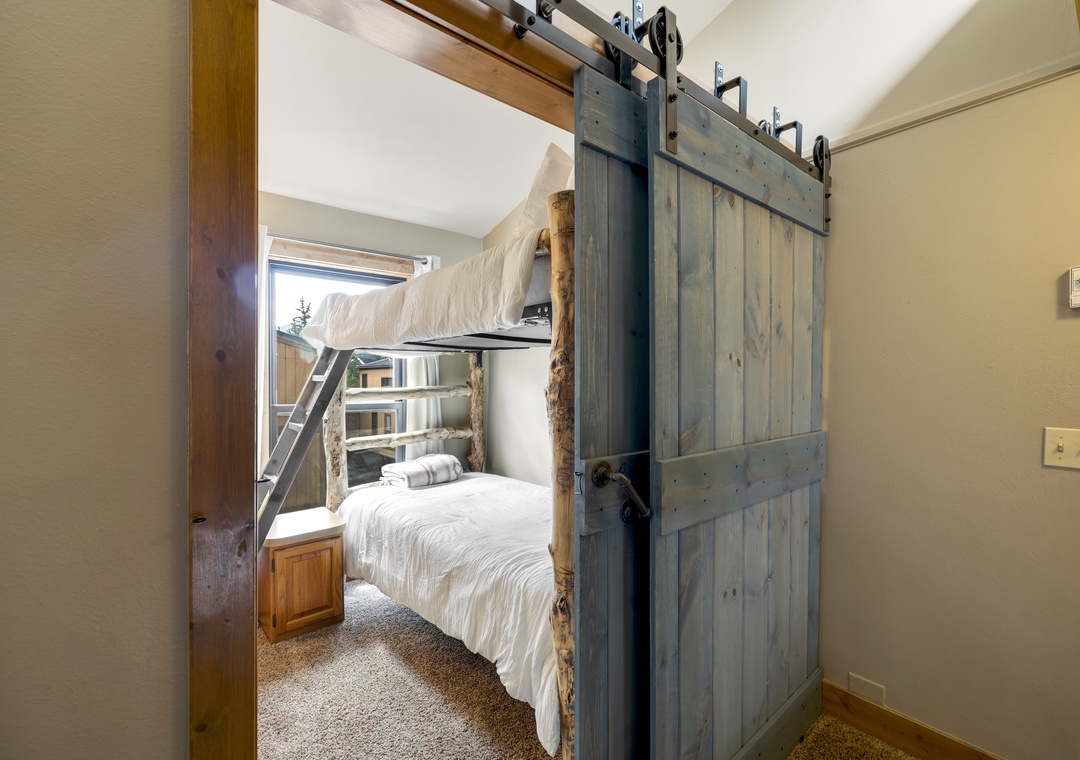 The main floor features a full bath (Including tub), closet, kitchen, dining area, and living room. The couch in the living room is a fold-out sleeper sofa. The upper floor features a spacious master bedroom with a king-sized bed, a closet, built-in dressers, and a standalone dresser. The upper floors also have a bathroom with a relaxing shower, a large hall closet, and a loft room with barn doors to close it off from the rest of the floor. The loft room features log-style bunk beds.