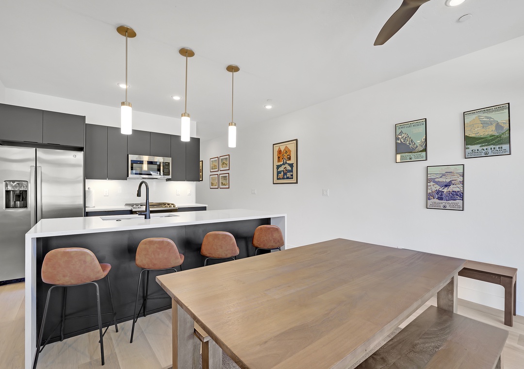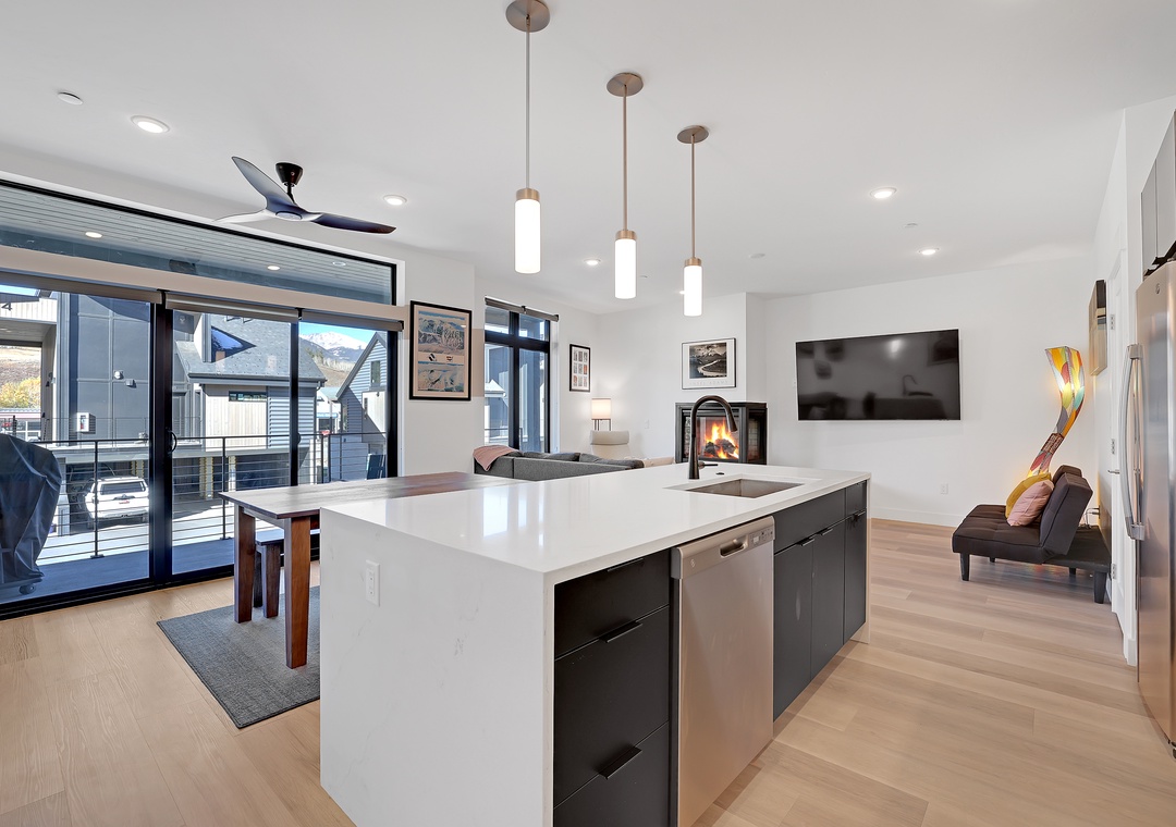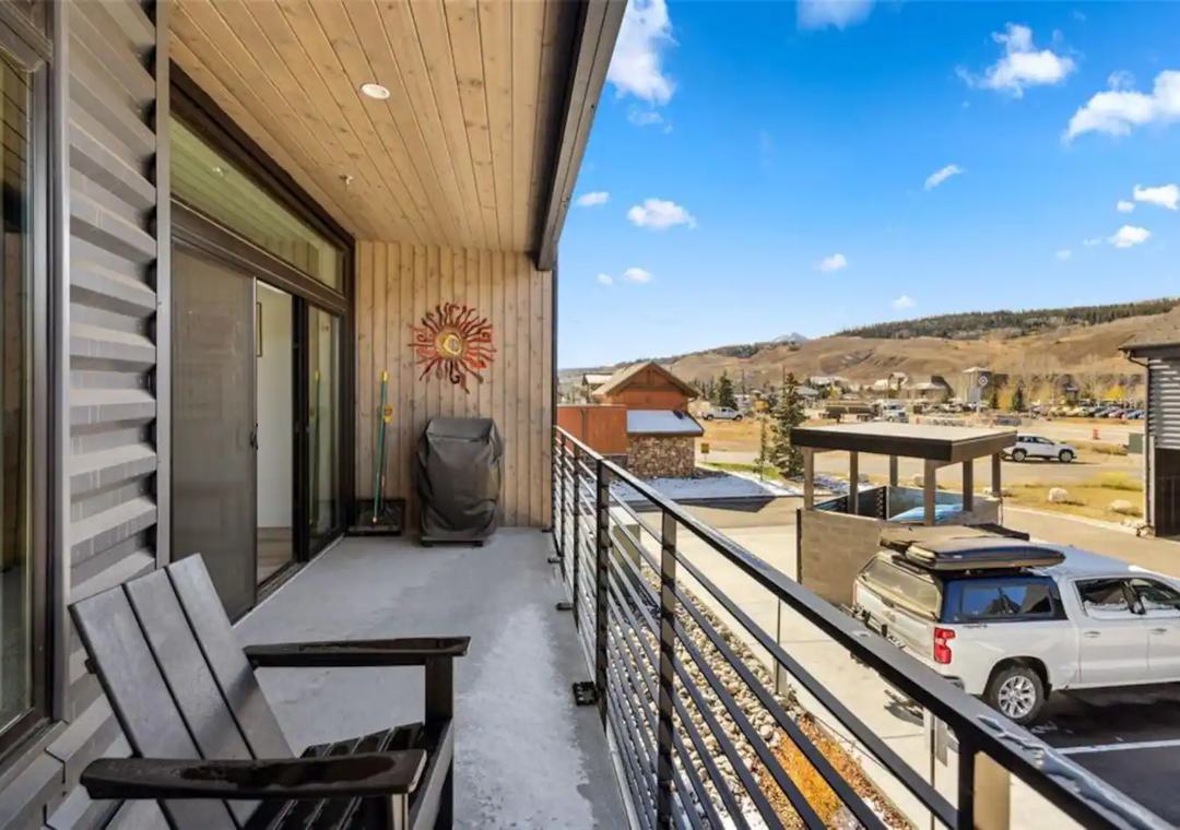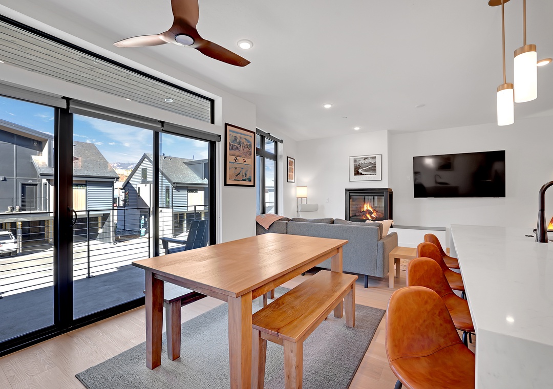 The kitchen is fully equipped with modern appliances and all the cooking essentials you need to prepare delicious meals during your stay. Adjacent to the kitchen, a lovely dining area offers seating for 6 guests, making it ideal for family meals or a cozy game night. Step outside to the private balcony, where you can relax and take in breathtaking views of the mountains and Blue River—a perfect spot for morning coffee or evening relaxation. Don't forget to pack your bathing suit and enjoy the on-site community hot tub on those cooler mountain nights!