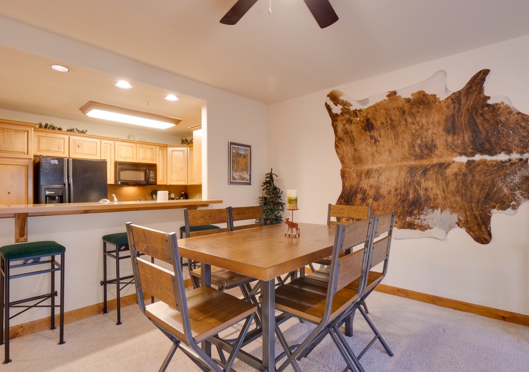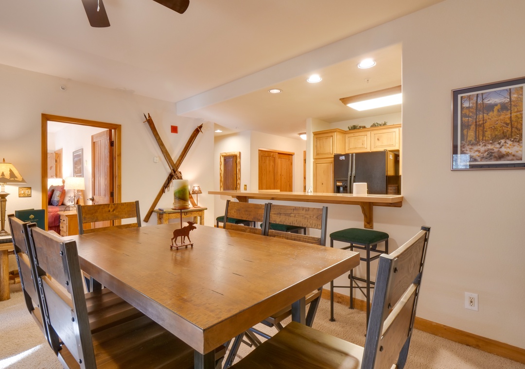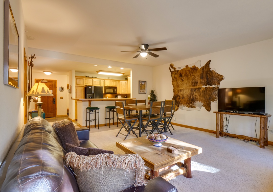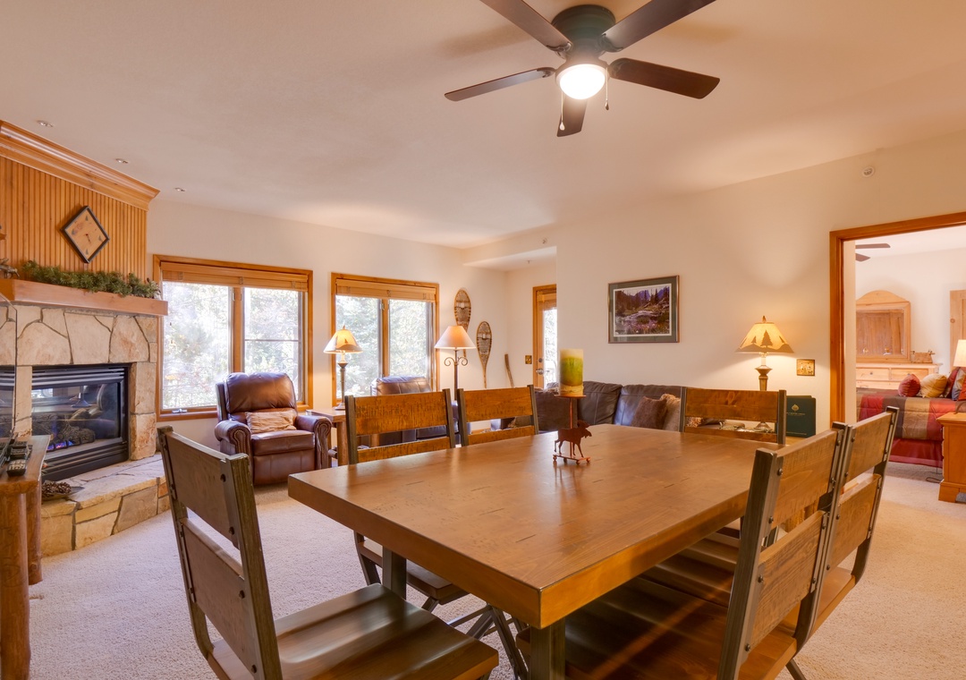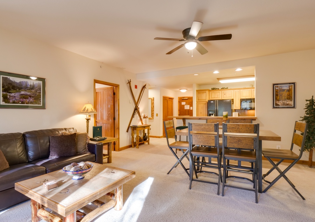 This two bedroom condominium is one of our best locations, and it's close to everything. Located at the base of the Snowflake chair lift, it is an easy two minute walk to the lift each day. When you're not skiing, it's just three blocks from the heart of downtown Breckenridge. This condo is highlighted with contemporary furnishings and an open living area and dining room. Guests really love the serenity of the quiet wooded backdrop and the nearby mountain stream in the summer. Complex amenities include underground heated parking, complimentary Wi-Fi, shared gas grills, indoor/outdoor hot tubs, sauna, steam room, private ski lockers and elevator access.