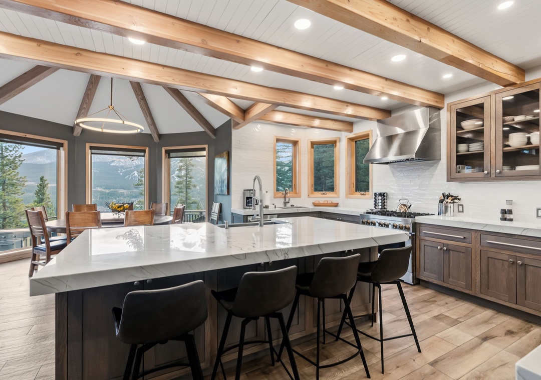 The kitchen is a culinary enthusiast's dream, equipped with top-of-the-line appliances, ample counter space, and a center island. There are two sinks and two dishwashers! It's also equipped with everything you need to make your delectable meals. Then gather around the dining table, where panoramic windows provide a backdrop of nature's splendor.