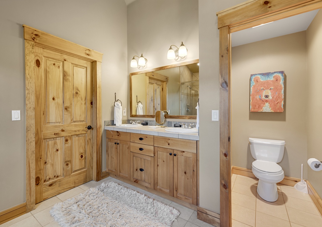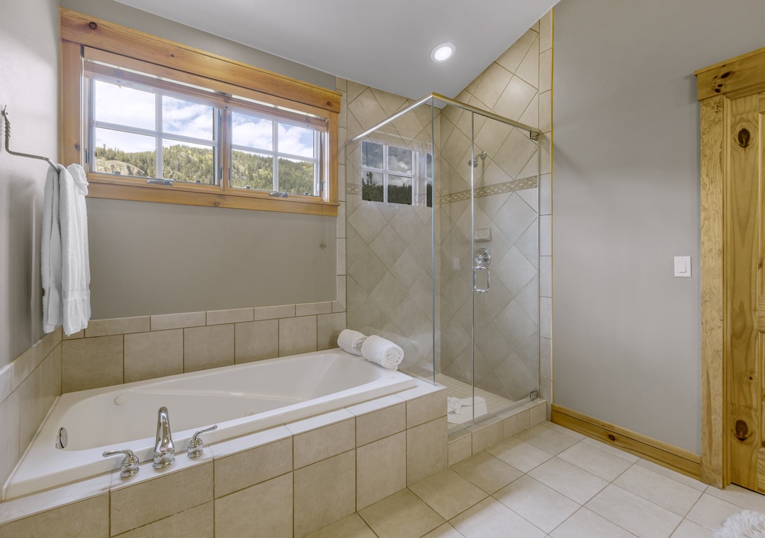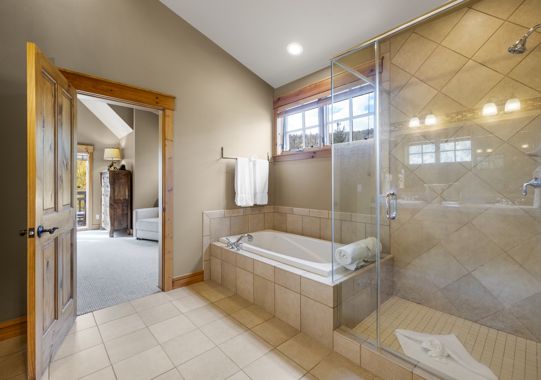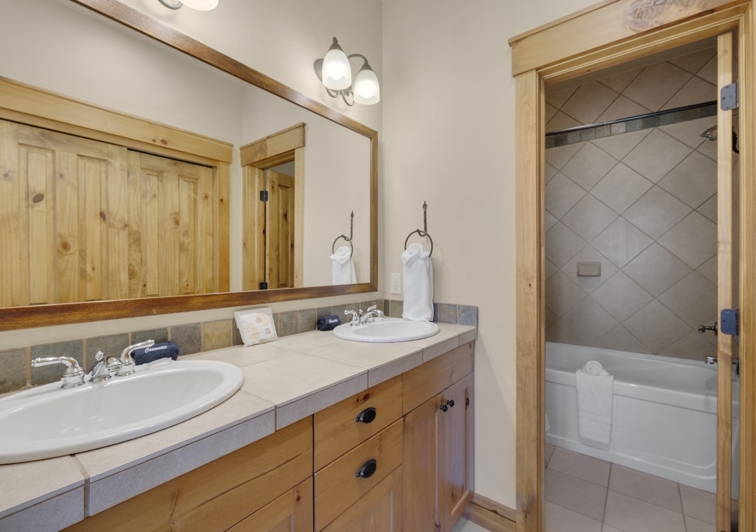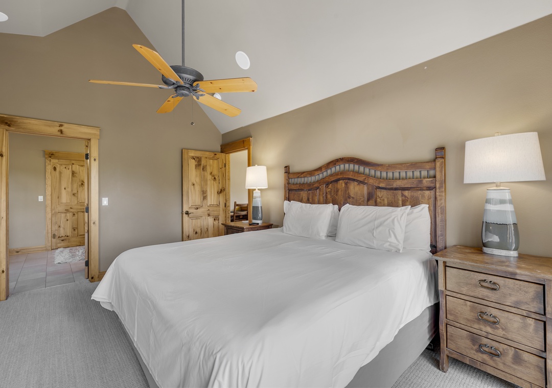 This 1,648 sq. ft. townhome comfortably sleeps 8-10 with a king in the primary suite, queen in the second bedroom, and a twin-over-full bunk bed in the third. Additionally, there is a queen sleeper sofa in the living room. Each bedroom offers comfortable bedding and ample storage, while two include en suites to give your group plenty of privacy. The primary bath includes a jetted soaking tub, double vanity, and a walk-in glass shower for that spa-like experience.