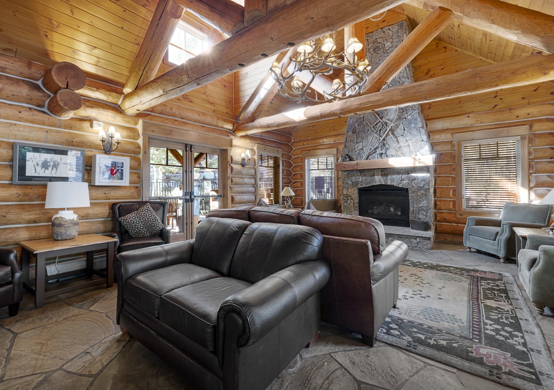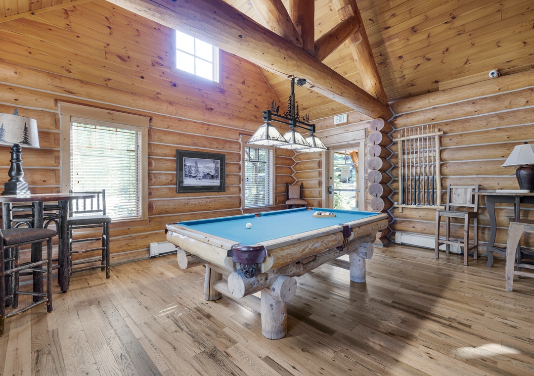 • Rustic log cabin lounge with indoor/outdoor fireplace, flat-screen TV, and billiards