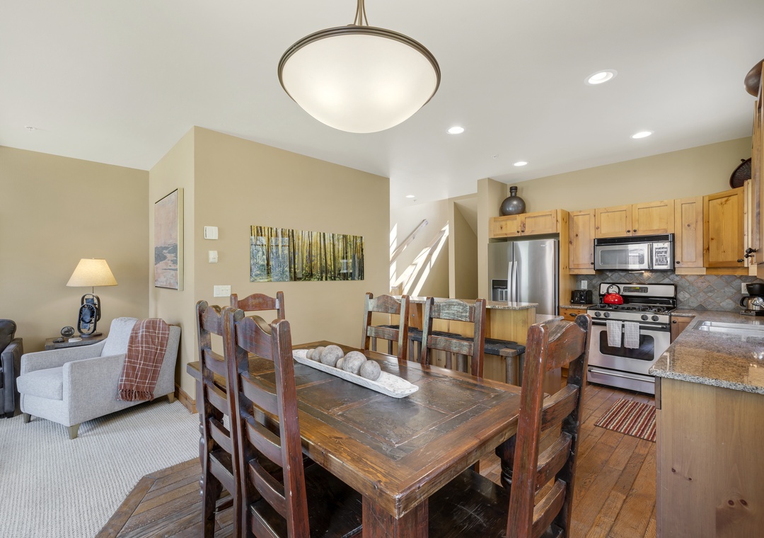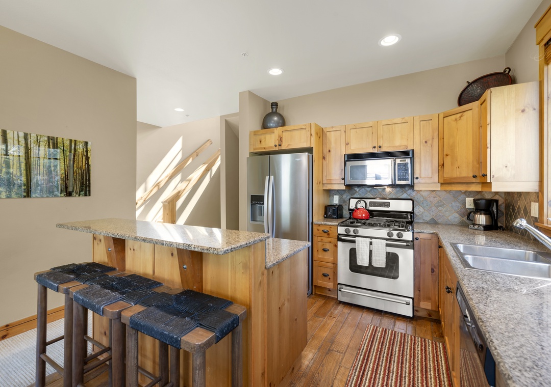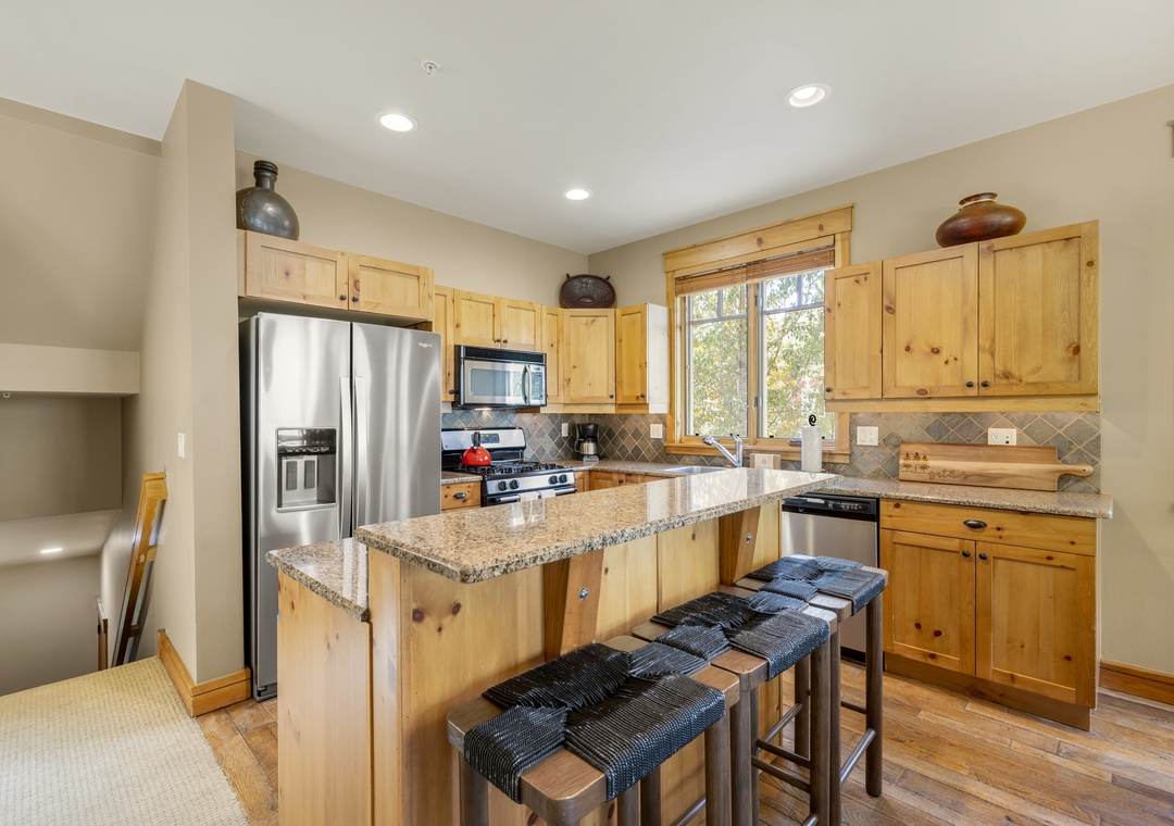 The kitchen is equipped with granite countertops, stainless steel appliances, and a gas cooktop, making it easy to whip up a post-adventure feast. The open-concept layout flows into the dining area and onto your private balcony, perfect for enjoying your morning outside or an evening under the stars all while taking in the stunning surroundings.
