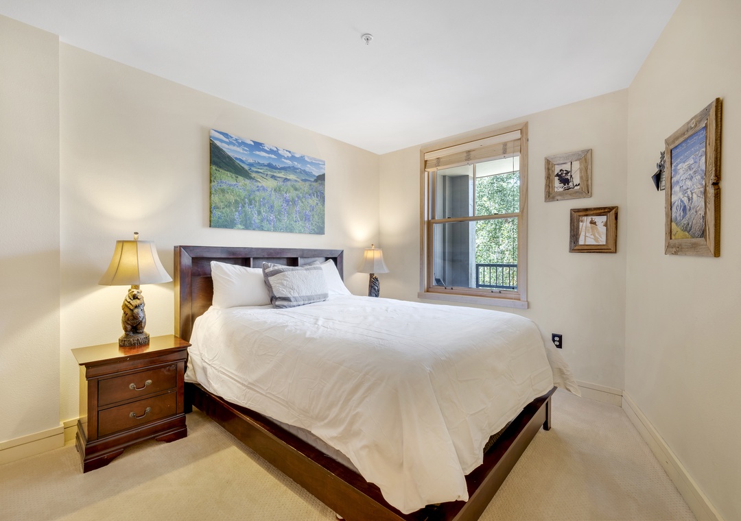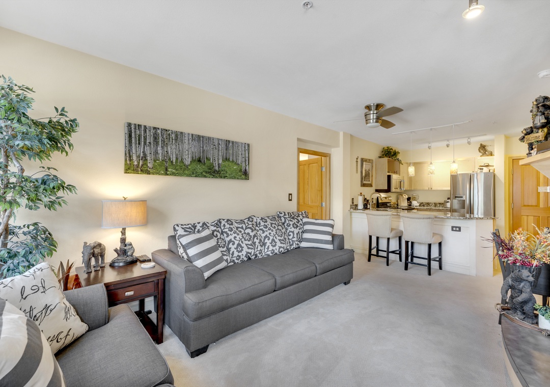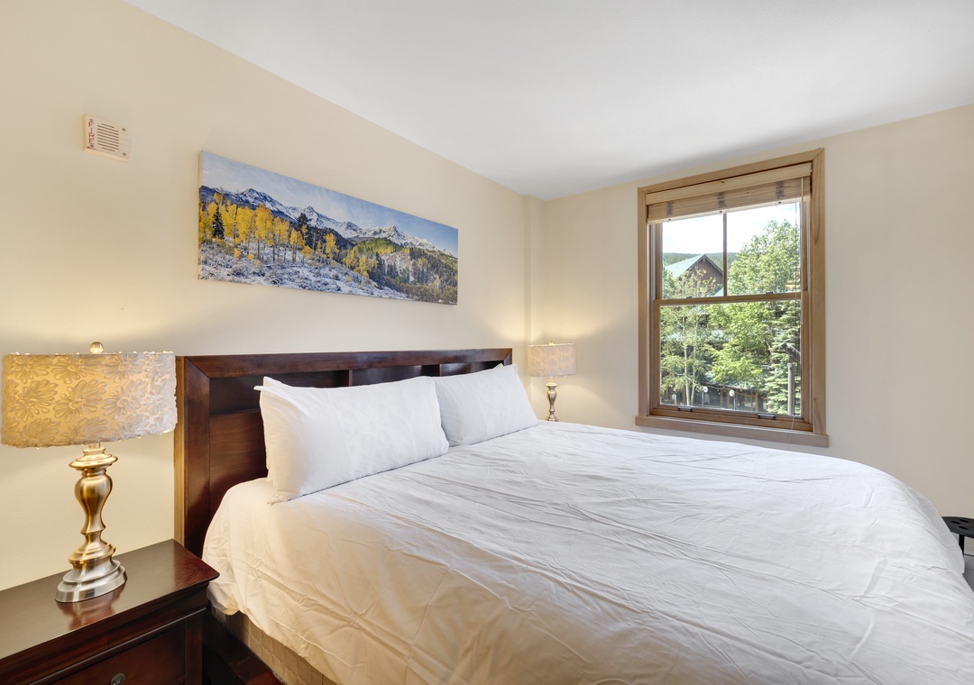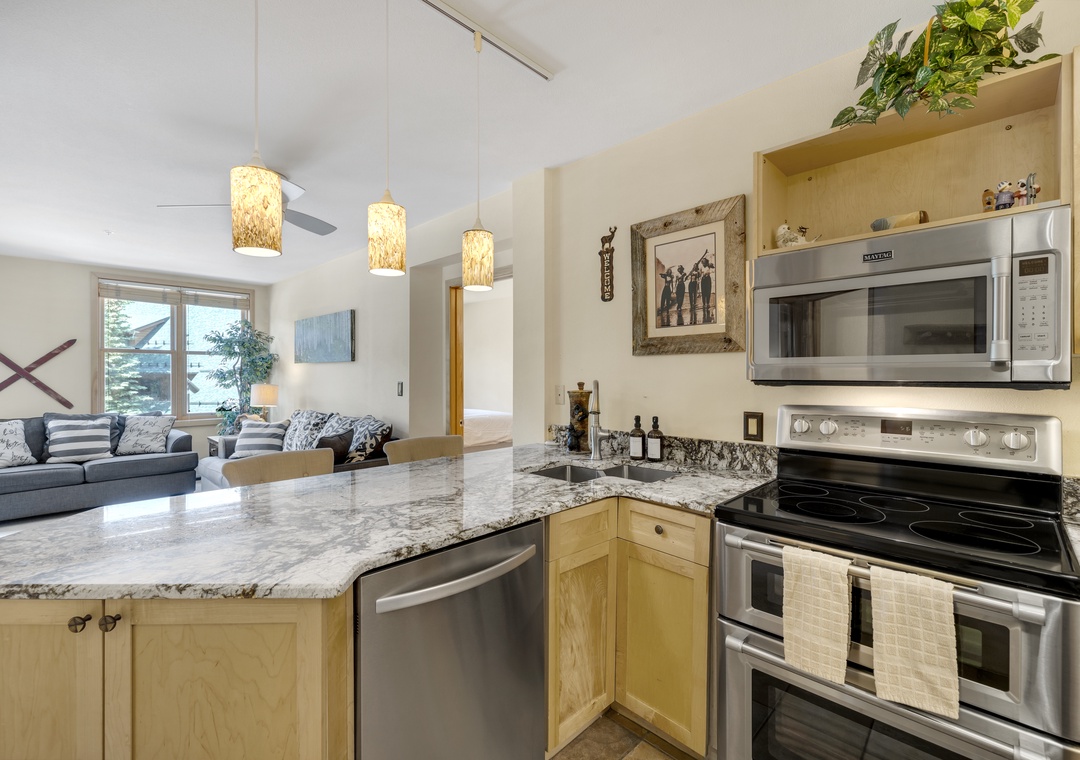 As you step inside, you’re immediately greeted by warm, rustic touches and cozy mountain décor that make you feel right at home. The open living area is thoughtfully furnished with a plush sofa, a gas fireplace for chilly evenings, and large windows that fill the space with natural light. Plus, the view of the mountain slope from the private balcony is phenomenal and you can even watch skiers and riders coming down right from the living room couch! The unit also has a flat-screen TV and high-speed Wi-Fi which provide modern comforts for relaxing after a day of adventure.