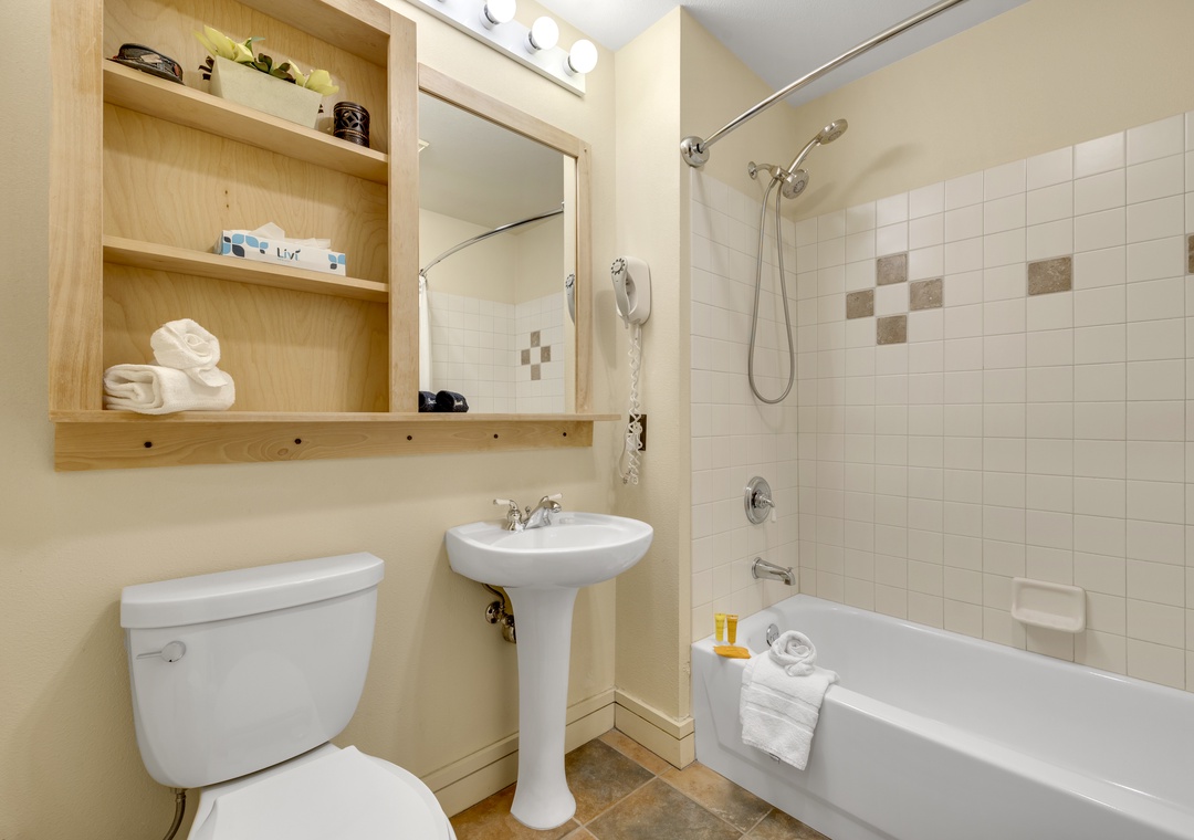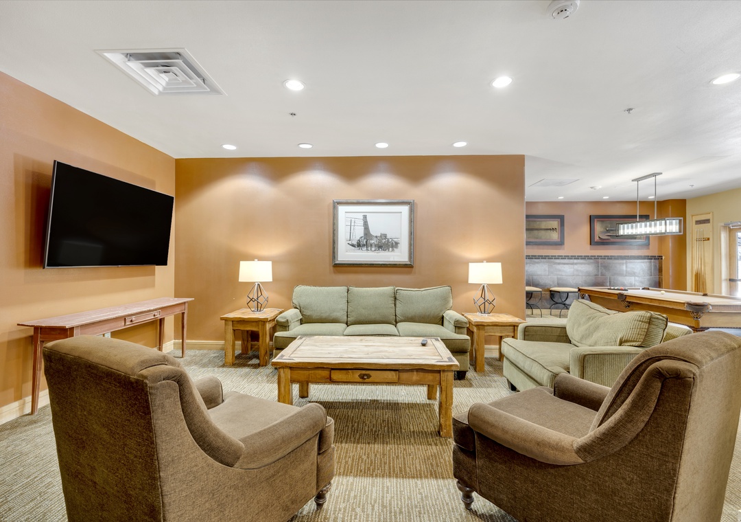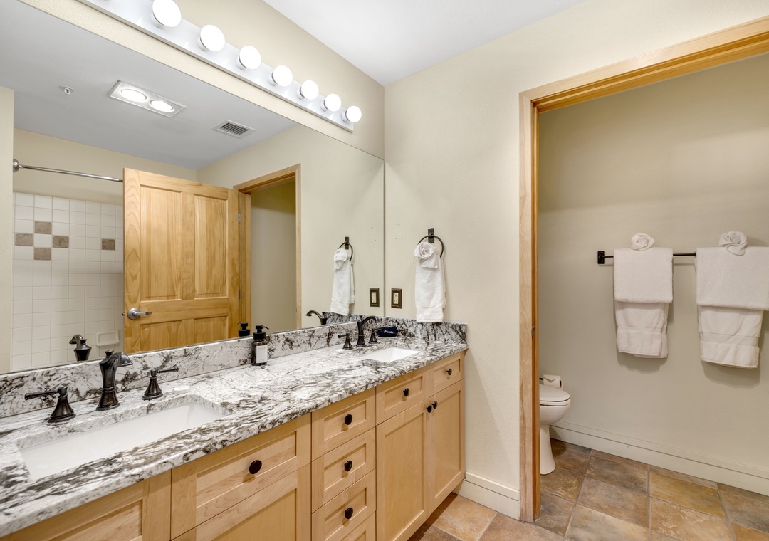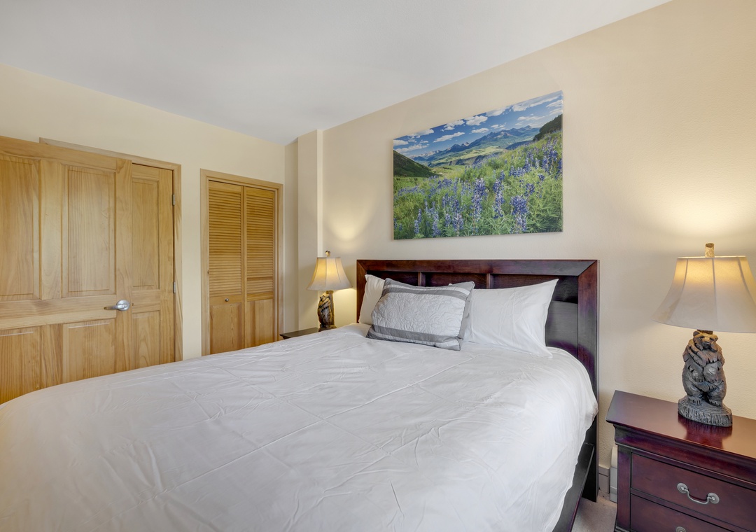 As you step inside, you’re immediately greeted by warm, rustic touches and cozy mountain décor that make you feel right at home. The open living area is thoughtfully furnished with a plush sofa, a gas fireplace for chilly evenings, and large windows that fill the space with natural light. Plus, the view of the mountain slope from the private balcony is phenomenal and you can even watch skiers and riders coming down right from the living room couch! The unit also has a flat-screen TV and high-speed Wi-Fi which provide modern comforts for relaxing after a day of adventure.