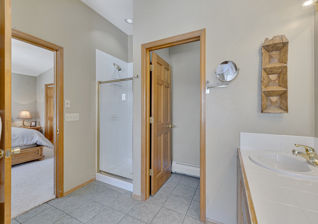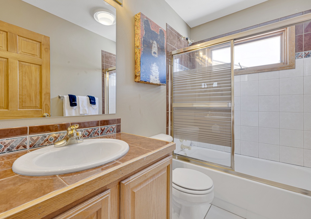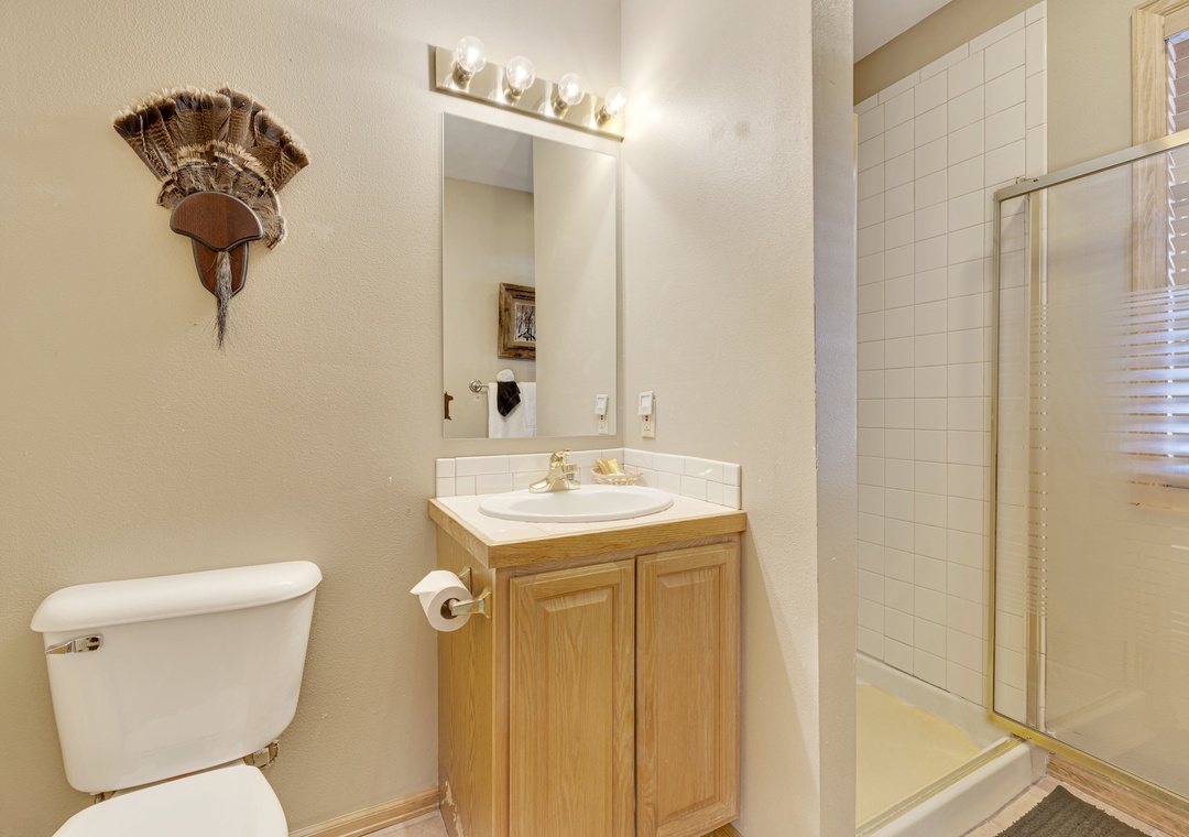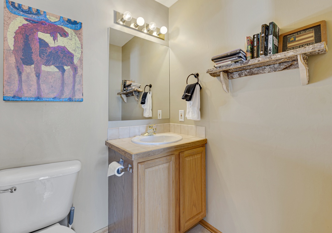 Upstairs you'll find the three bedrooms. The cozy Fox bedroom has a king bed and an en-suite bathroom. The spacious bathroom boasts dual vanity sinks, and walk-in shower. The Moose bedroom has a queen bed plus a twin bed. Then the Bear bedroom has a twin bunk bed plus an additional twin bed. The second and third bedroom have access to the full bathroom upstairs too. Downstairs you'll find the den and another full-sized bathroom. The Elk bedroom is equipped with a queen bed, making this space feel like it's own suite. Every bedroom has it's own flatscreen TV.