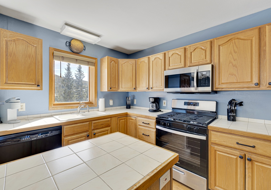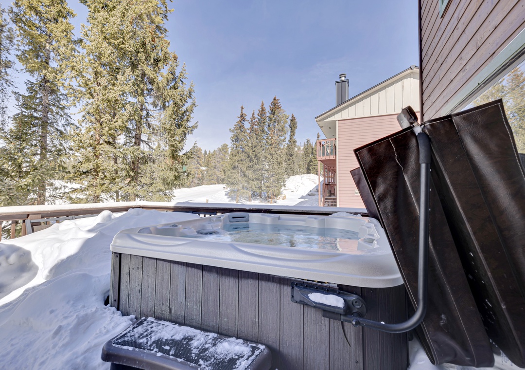 Inside, the property boasts a spacious and inviting living area, complete with comfortable furnishings and a cozy fireplace, perfect for unwinding after a long day of skiing or hiking. The main level is dedicated to the common areas including the kitchen, living room, and dining area. You'll also find the private hot tub right off the living room. The fully equipped kitchen features plenty of countertop space and everything you need to whip up a gourmet meal for your family or friends. There is is also a gas grill off the back deck. The dining area comfortably seats six, providing the perfect space to enjoy meals together.