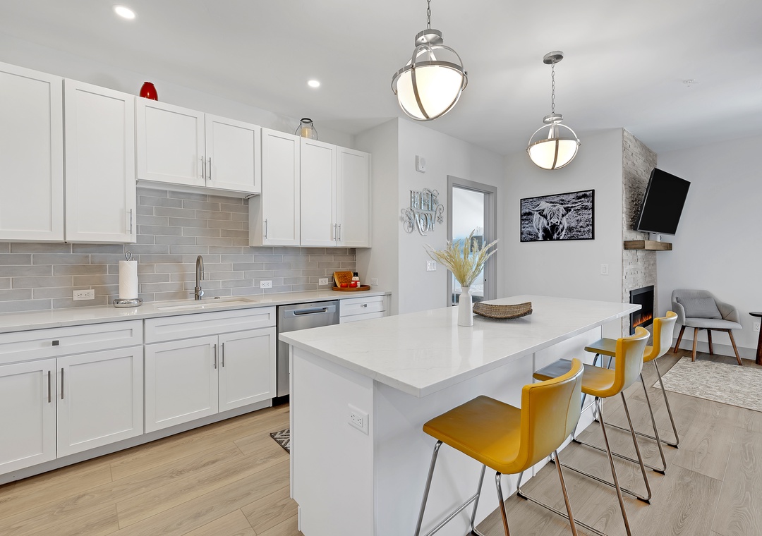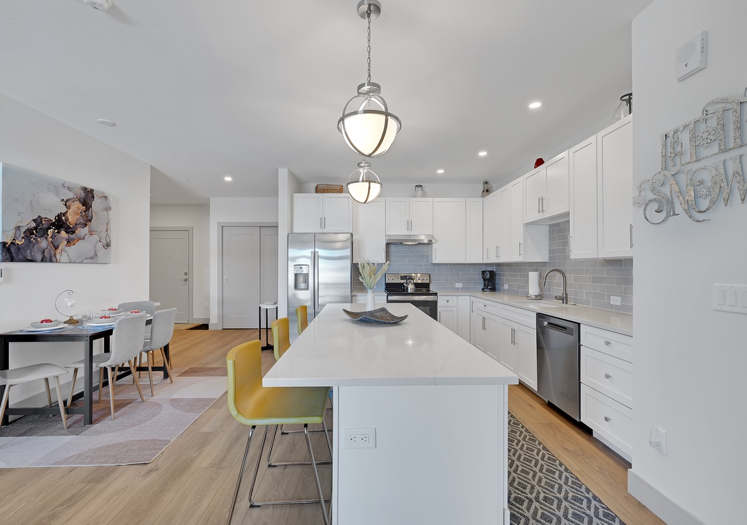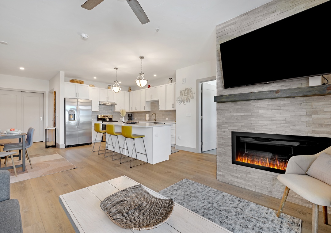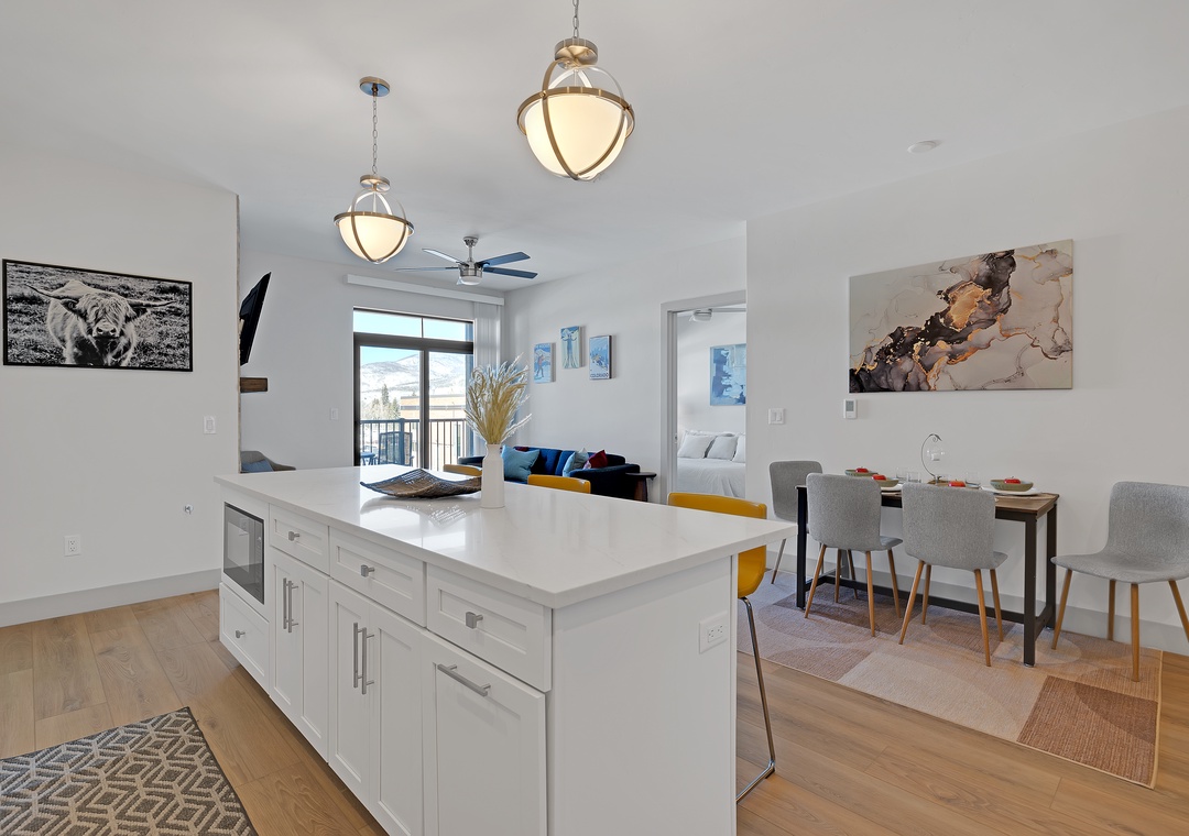 Step inside to an open-concept living area with contemporary furnishings, a fully equipped kitchen, and large windows that flood the space with natural light. The comfortable living room is perfect for unwinding after a day of adventure, with a flat-screen TV and cozy seating. The well-appointed kitchen makes it easy to prepare meals, and the dining area is perfect for enjoying them with family or friends.