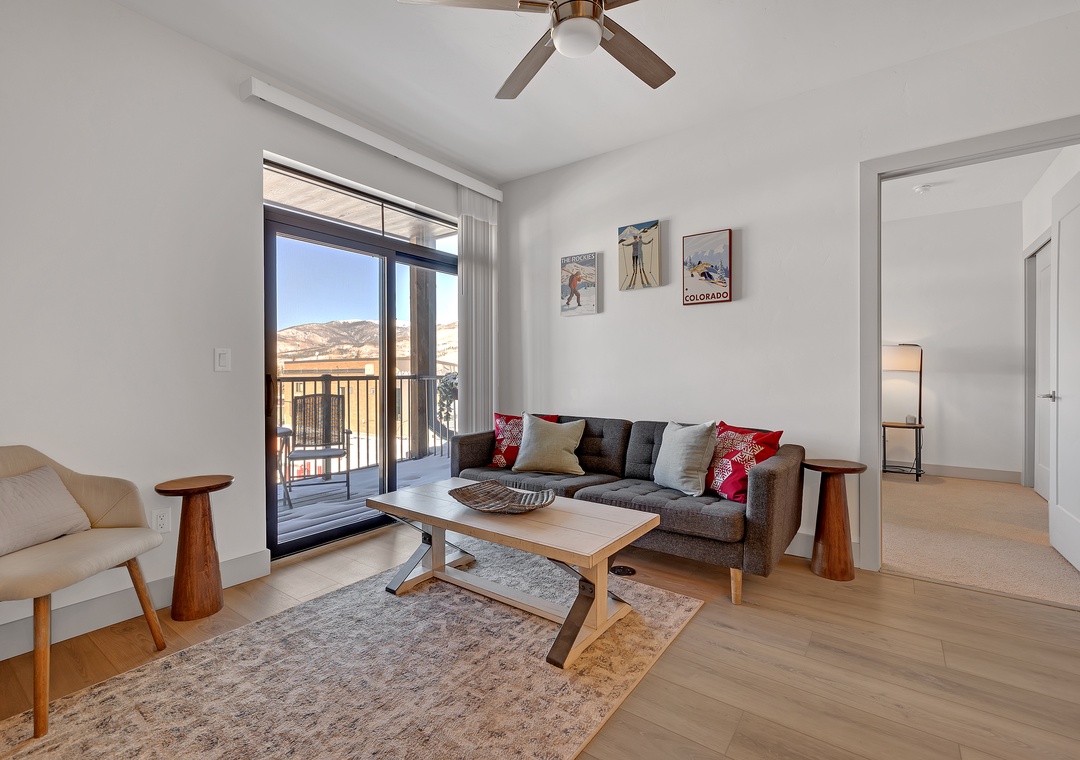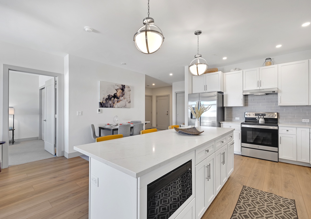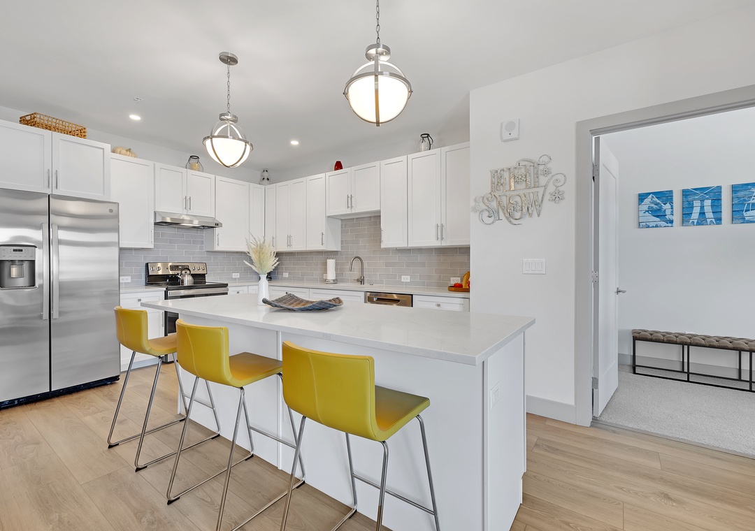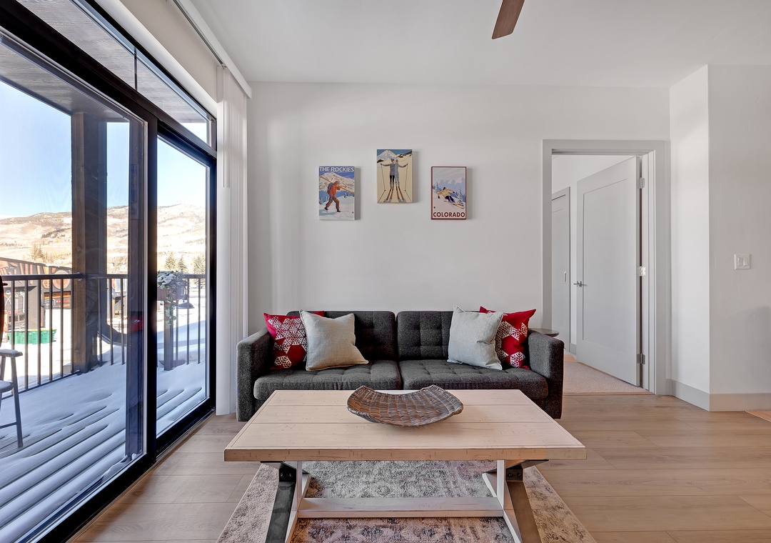 Step inside to an open-concept living area with contemporary furnishings, a fully equipped kitchen, and large windows that flood the space with natural light. The comfortable living room is perfect for unwinding after a day of adventure, with a flat-screen TV and cozy seating. The well-appointed kitchen makes it easy to prepare meals, and the dining area is perfect for enjoying them with family or friends.