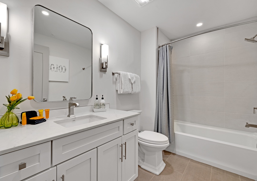 The primary bedroom features a king-size bed, while the second bedroom offers a bunk with Twin over full layout with an additional trundle bed underneath, making this condo an excellent choice for families or groups. Both bathrooms are beautifully designed with modern finishes and offer plenty of space to get ready for the day.