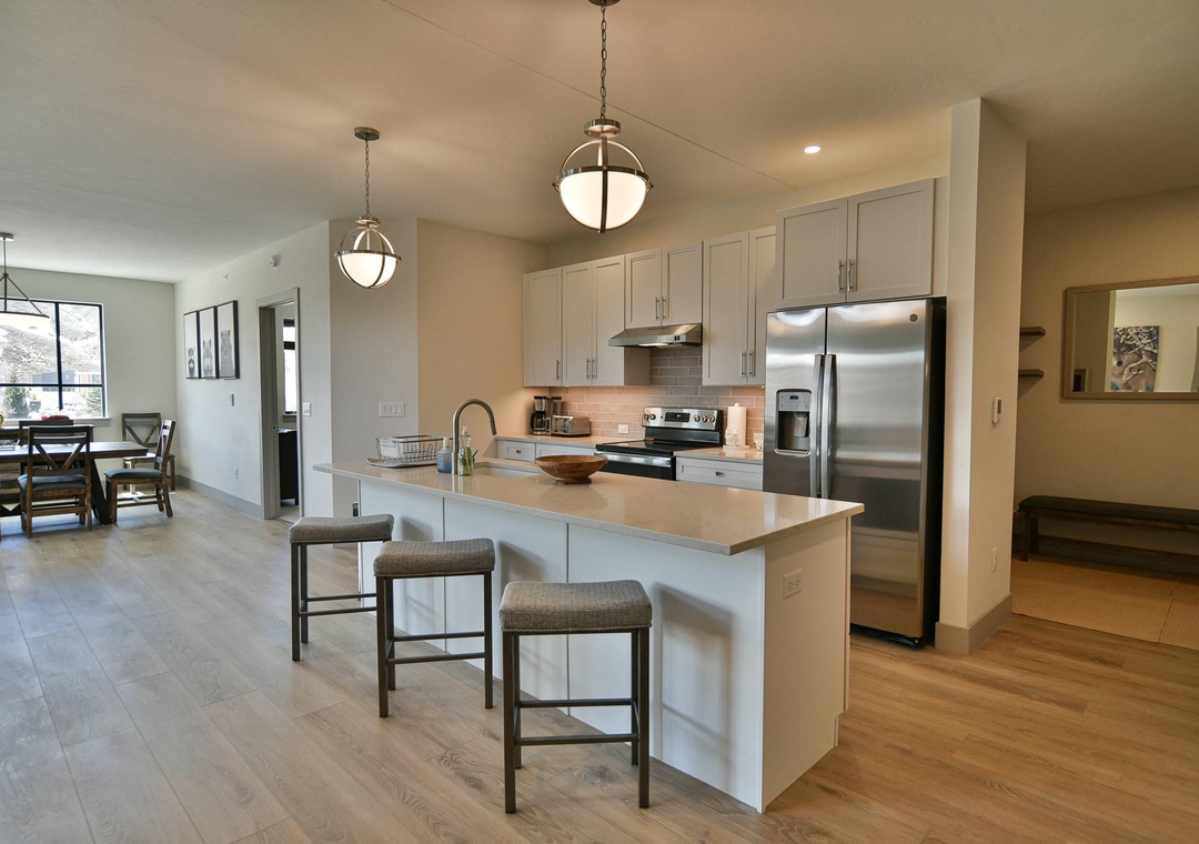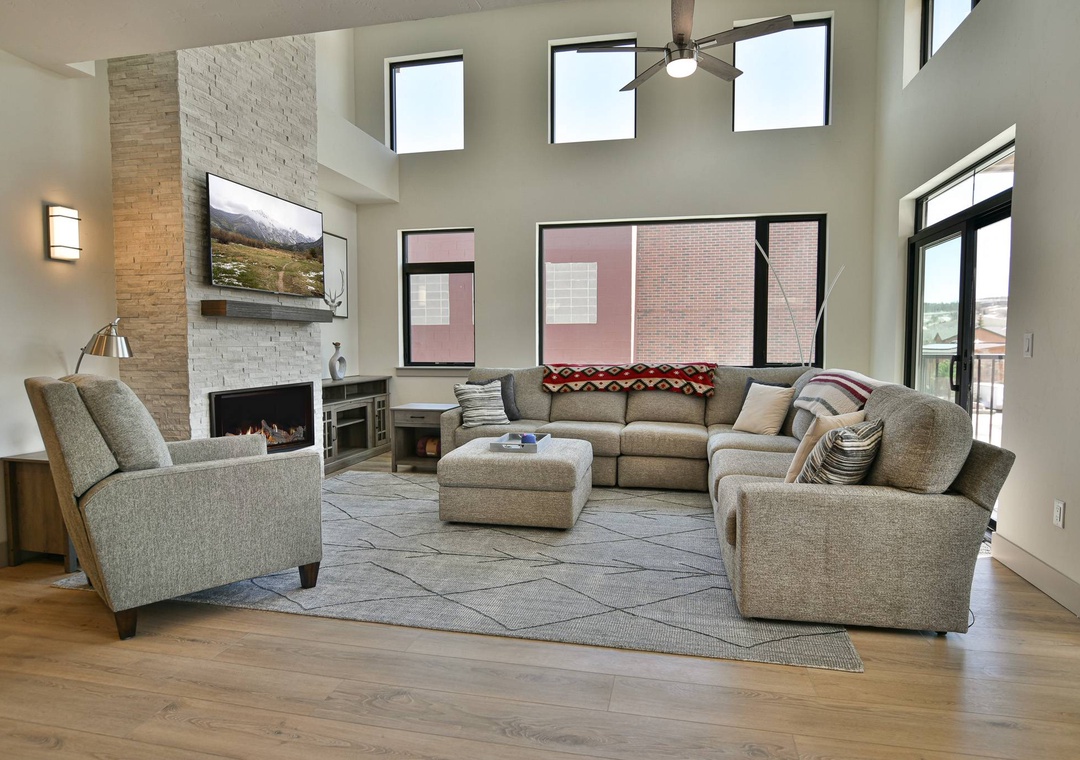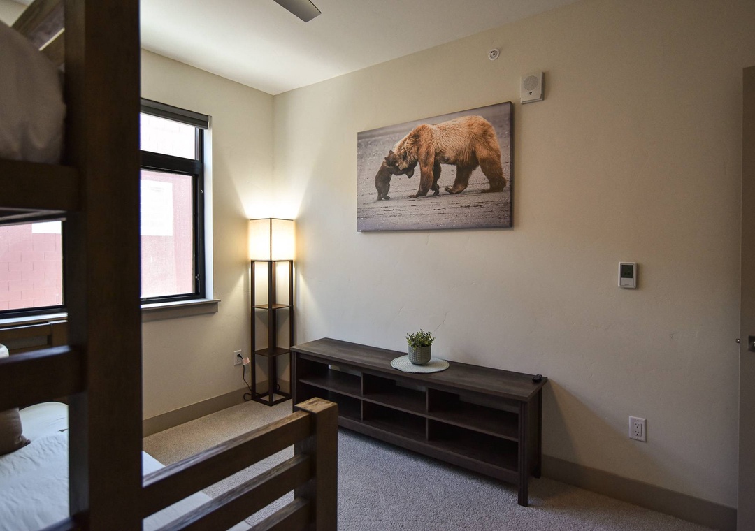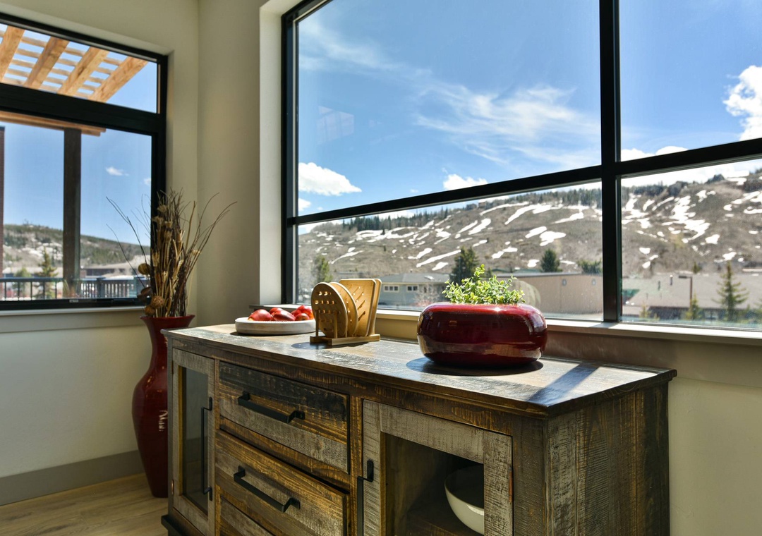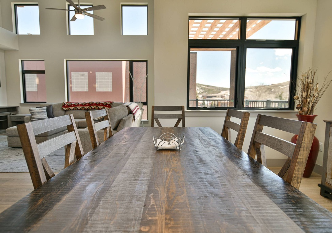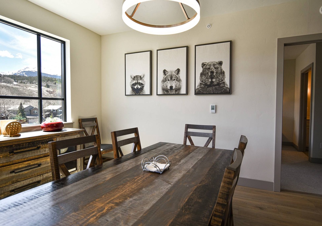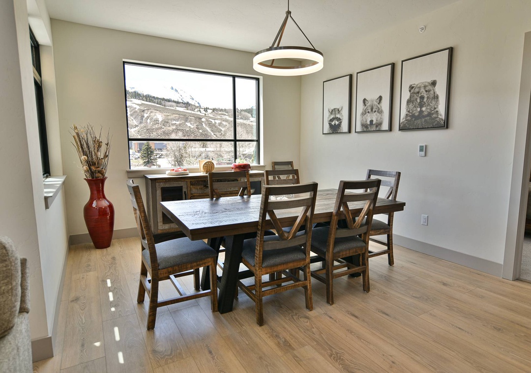 Step inside to an open-concept living area with mountain furnishings, a fully equipped kitchen, and large windows that flood the space with natural light. The comfortable living room is perfect for unwinding after a day of adventure, with a flat-screen TV and plenty of seating. The well-appointed kitchen makes it easy to prepare meals, and the dining area is perfect for enjoying them with your group.