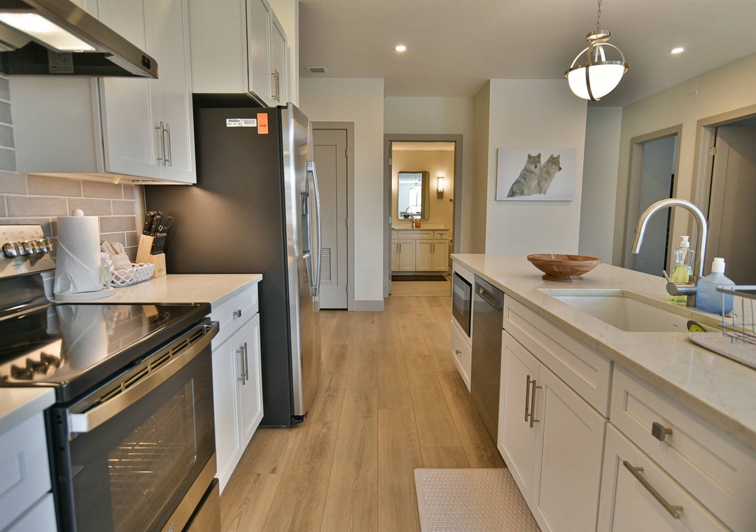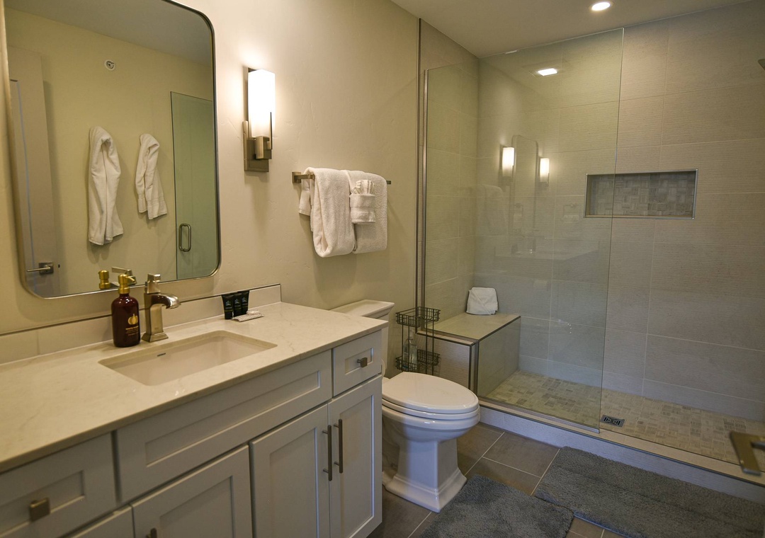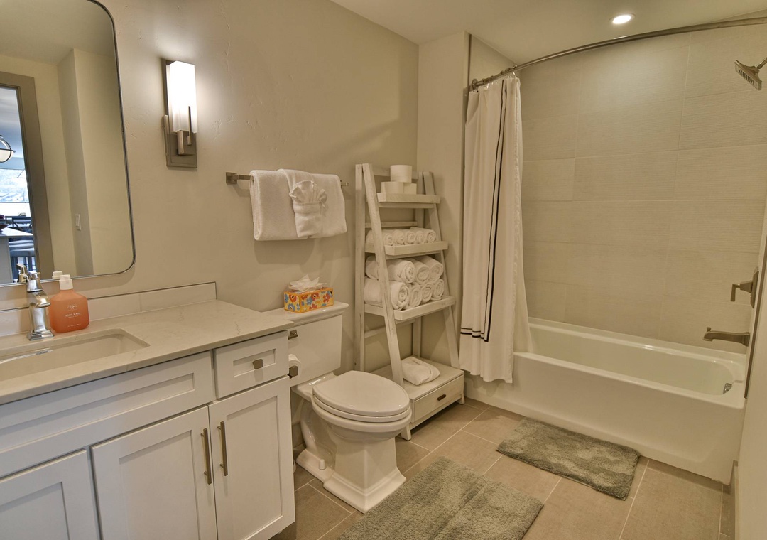 The primary bedroom features a king-size bed with premium linens, while the second bedroom offers a queen bed and the third bedroom boasts a bunk bed with a Twin over Queen layout. This bed layout makes this condo an excellent choice for families or groups. Both bathrooms are beautifully designed with modern finishes and offer plenty of space to get ready for the day.