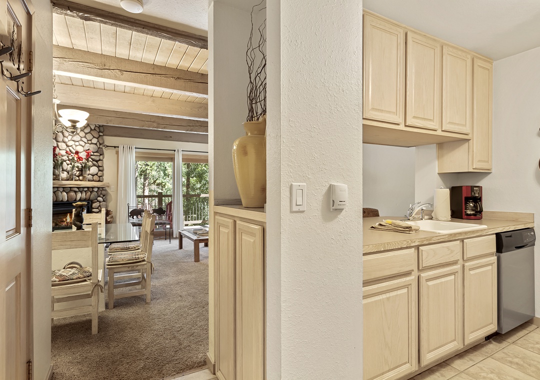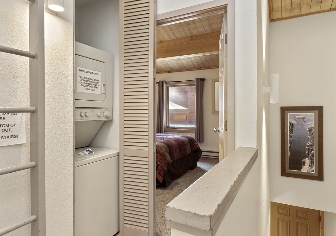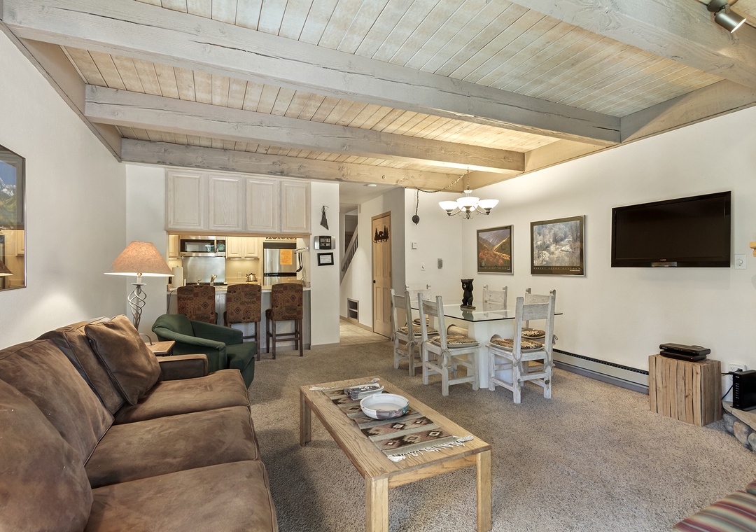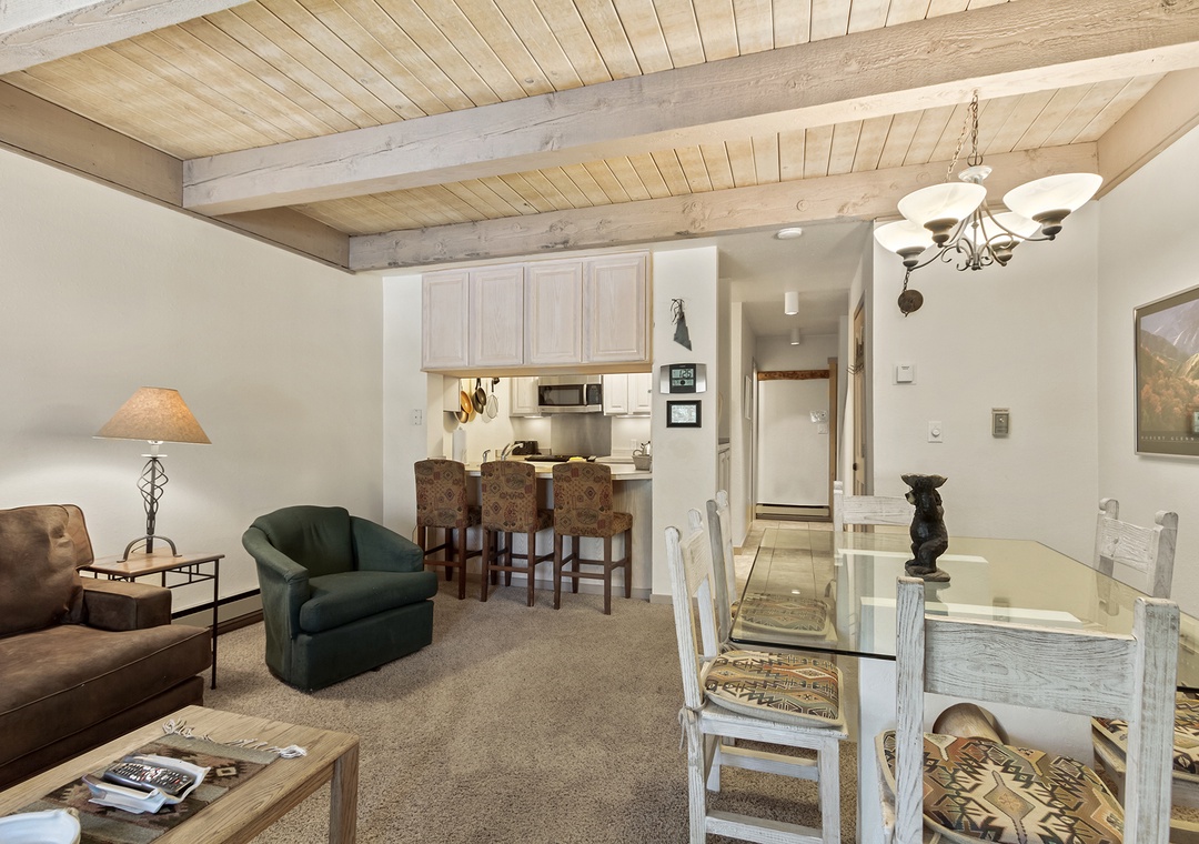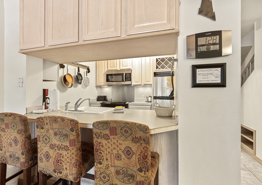 There is an alley kitchen that is semi-open to the living room, for everyone to be able to be together. The condo is equipped with lots of family friendly games. With both bedrooms upstairs, those who like to stay up doing puzzles and games won't disrupt the early bird skiers getting rest for a big day on the mountain.