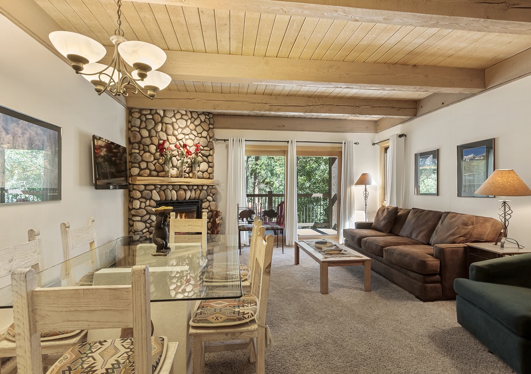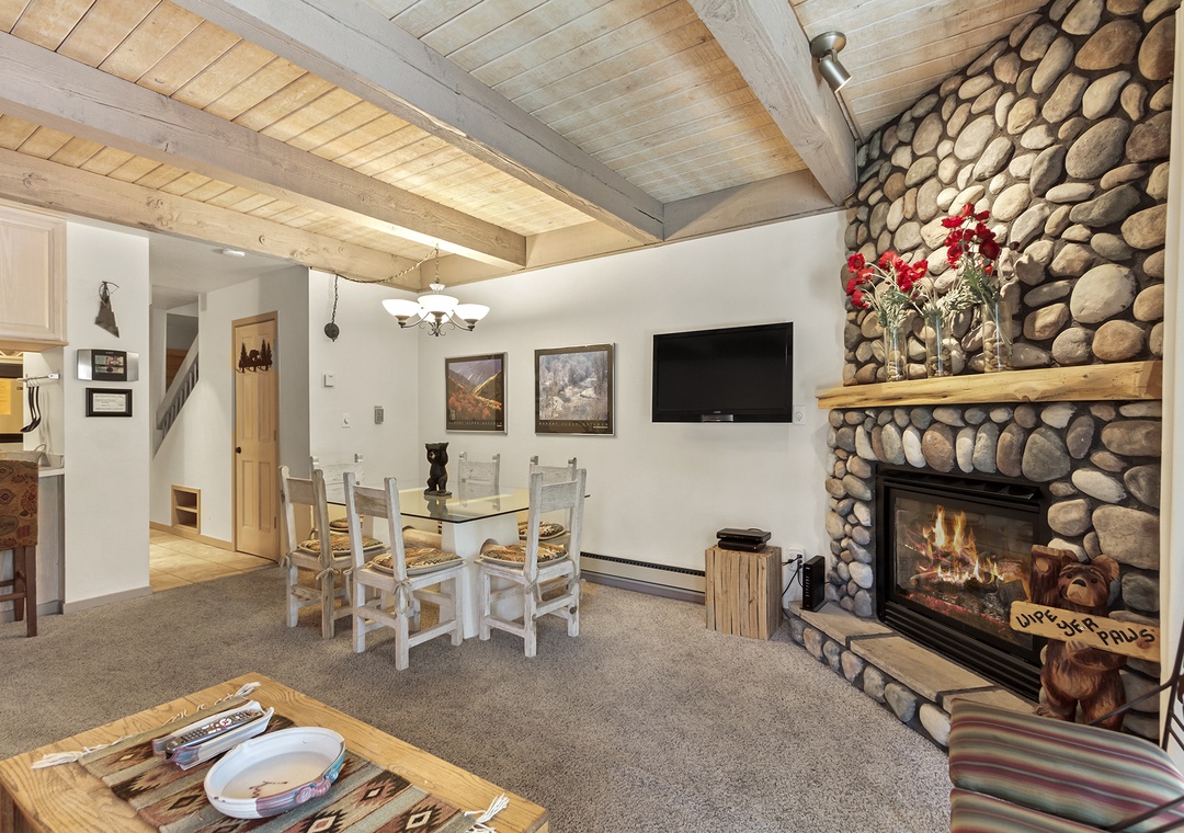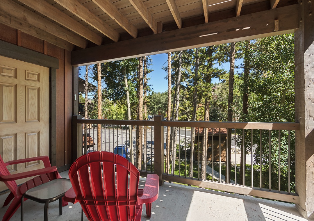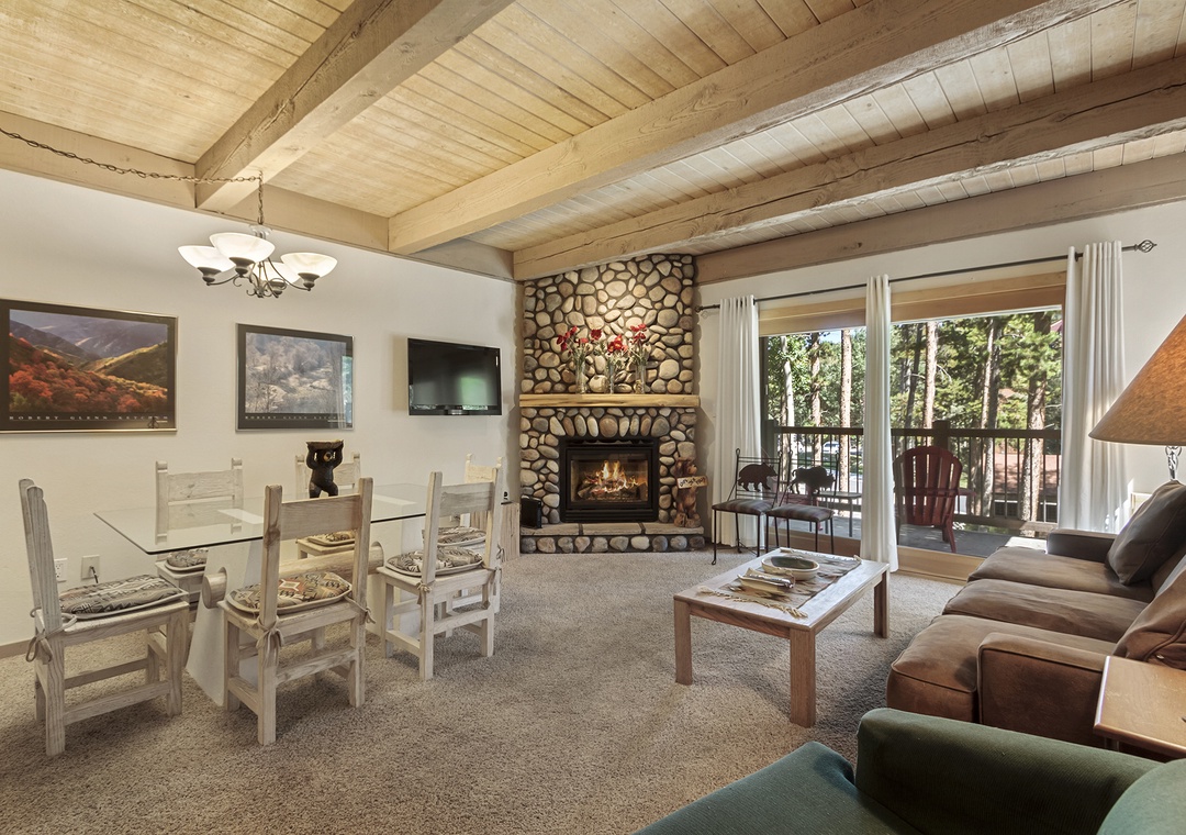 Enjoy the mountain breeze while sitting on the covered balcony. Or cozy up by the fireplace after a day on the slopes.
