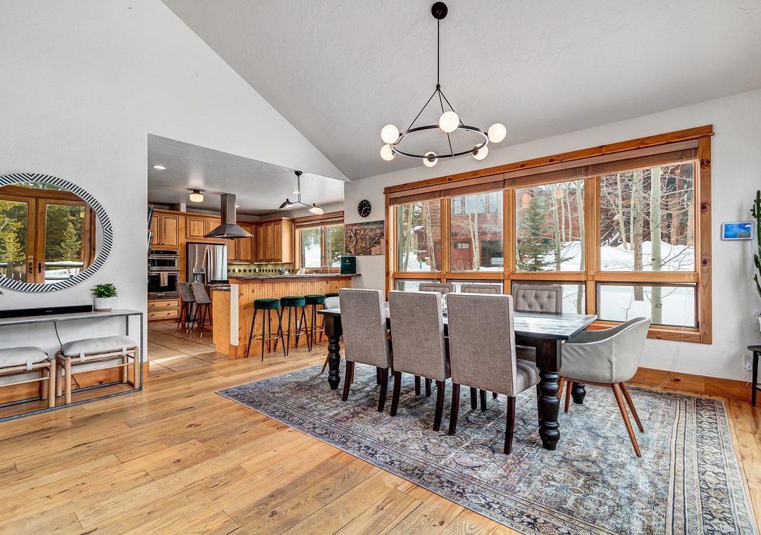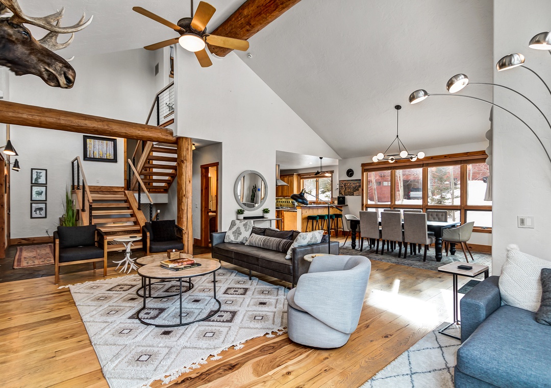 The Snowflake Chalet is a gorgeous four bedroom + loft private home right on the Snowflake Ski Run, with views of the Snowflake Chairlift. This 3-level, 4000 square foot, ski-in/ski-out home provides seamless access to the ski resort. Enjoy your private hot tub right off the ski run at the end of the day or the beautiful views from the vaulted floor to ceiling windows in the living room.