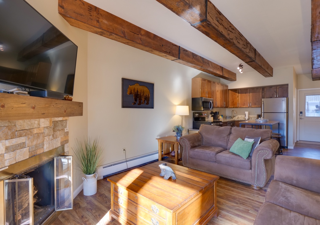 Step inside to find a cozy space perfect for up to guests. The living area is a great spot for relaxation, complete with a welcoming fireplace and a well-equipped kitchen for your culinary needs.