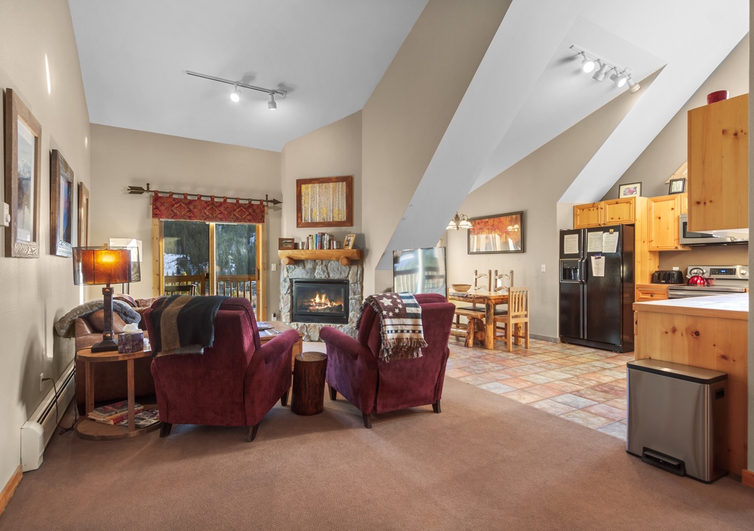 Step inside to a cozy and well-appointed living space where comfort meets style. The open-concept design features a welcoming living area with a fireplace, providing a perfect spot to relax after a day on the slopes. The fully equipped kitchen is a chef's delight, featuring modern appliances and a spacious dining area for delightful meals with family and friends.