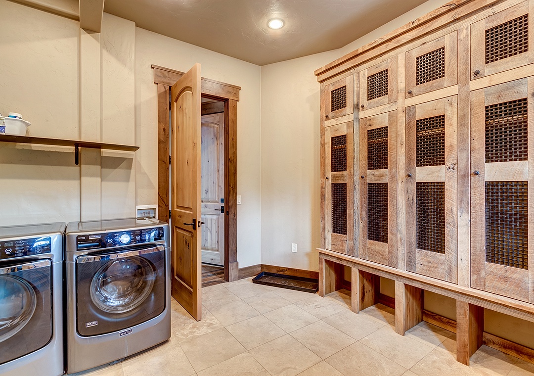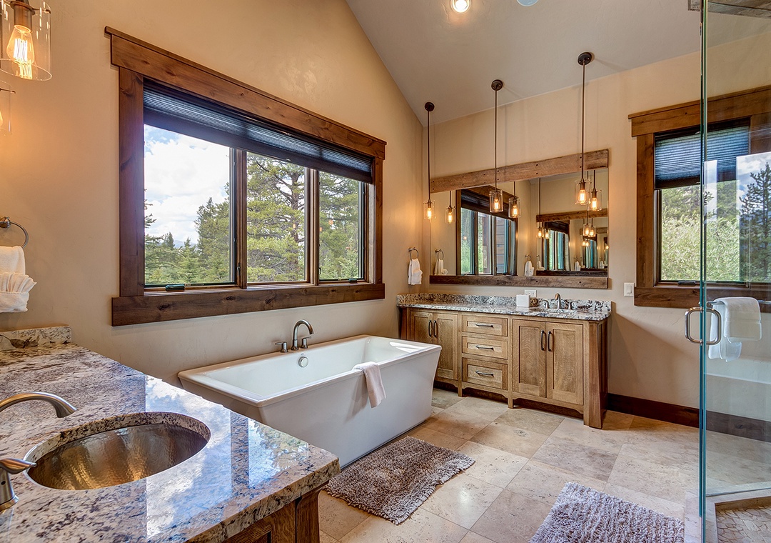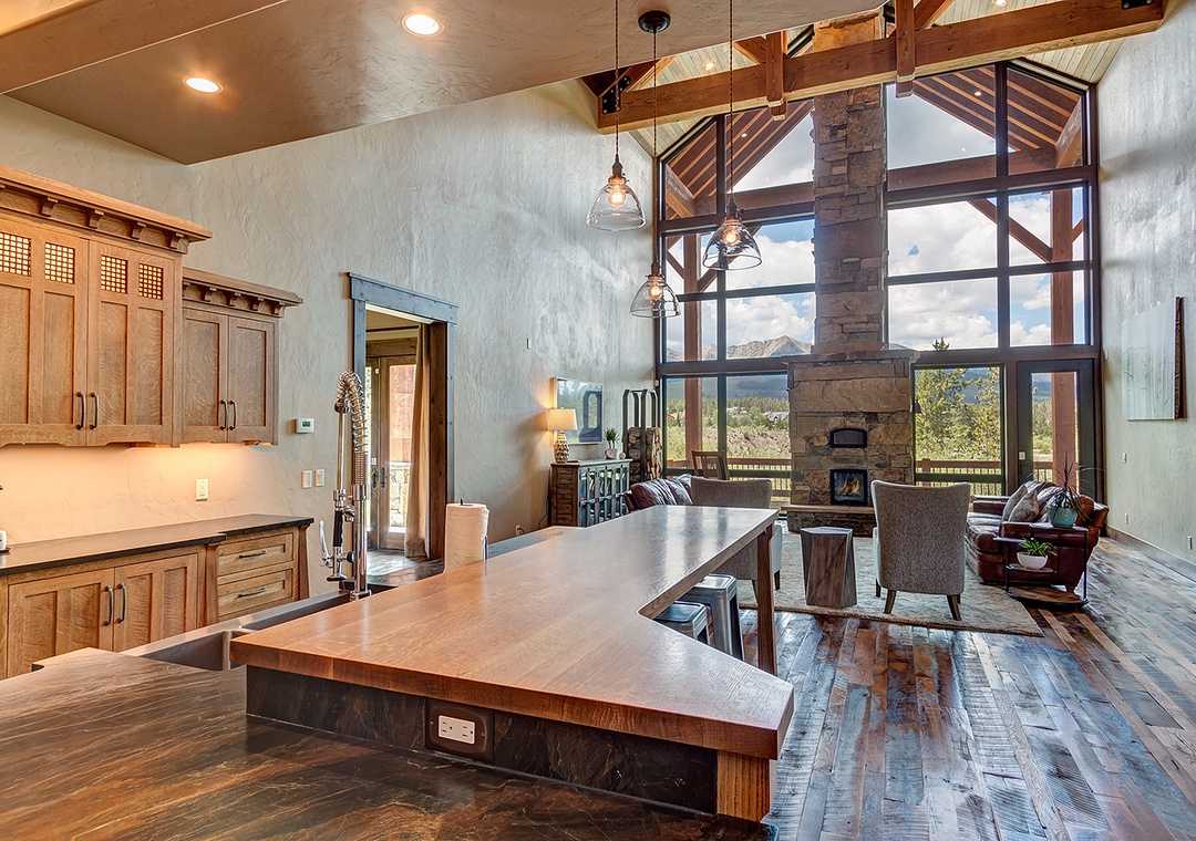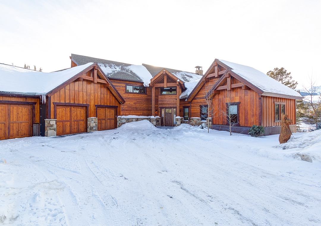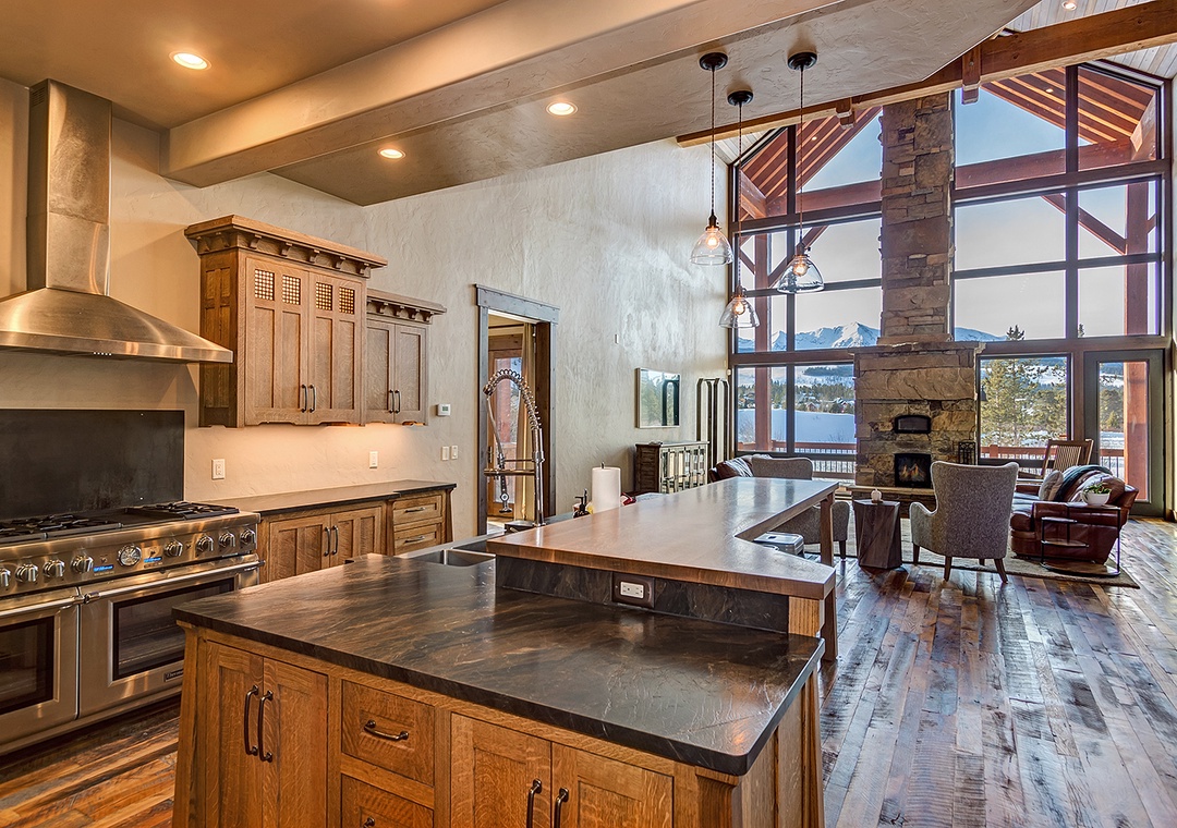 Walk into the main entrance from the beautiful custom front door, or from the 3-car heated garage that gives guests plenty of parking space, to see a large open floor plan with dramatic vaulted ceilings, gorgeous windows with mountain views, high-end hardwood flooring, top-of-the-line custom finishes, a cozy custom-built fireplace, metal and stonework, and mountain modern decor. The huge living room located on the main floor has a custom-framed flat screen high-def TV along with a Super Nintendo, HBO, and Showtime, big beautiful windows that offer amazing views of the iconic Breckenridge mountains, ample seating including leather couches, and gorgeous custom stone fireplace. Walk into the open, entertaining kitchen from the living area that is equipped with a double oven, and large stove with hood, countertop seating for 4, and a large refrigerator hidden by the custom wood design that comprises the kitchen - the perfect space for a holiday stay with family and friends. Also on the main floor is the laundry/mud area that includes storage for ski equipment, and the large master suite with a king bed and master bathroom with natural sunlight from the windows, a walk-in shower, stand-alone tub, and his and her vanity sink.