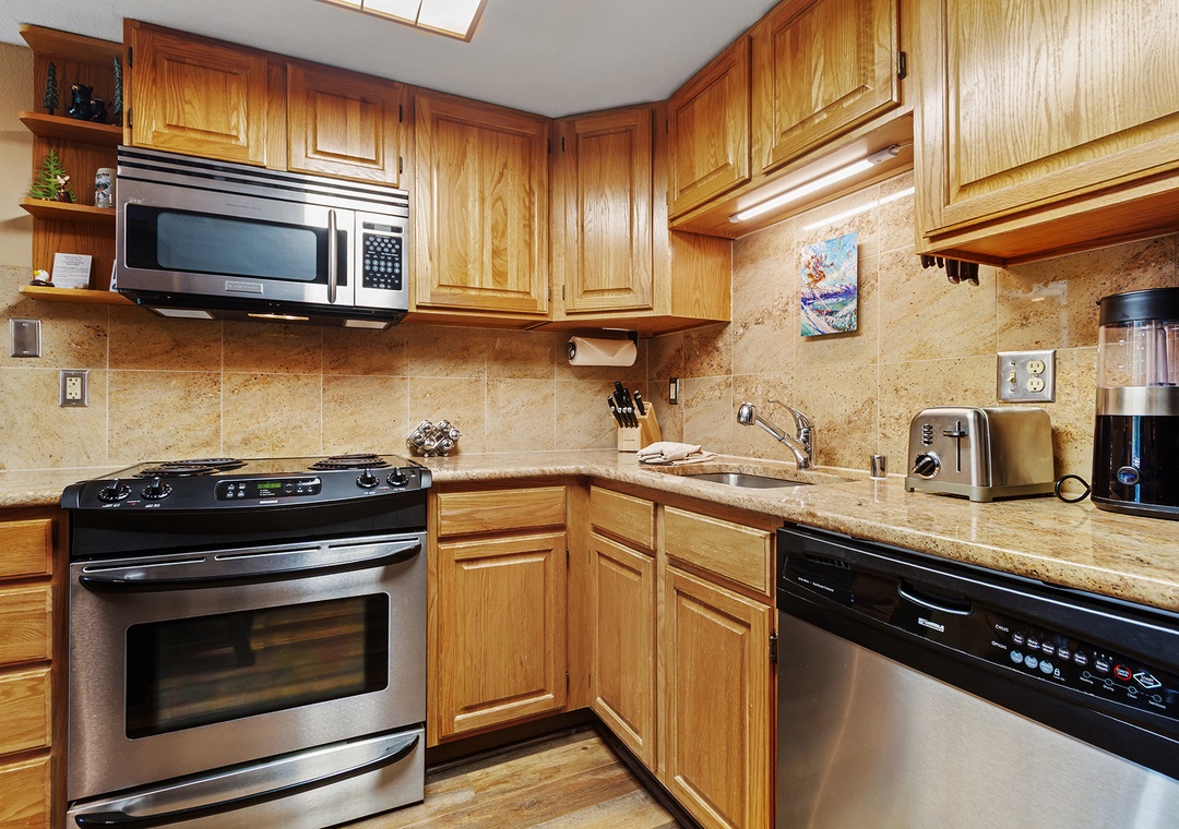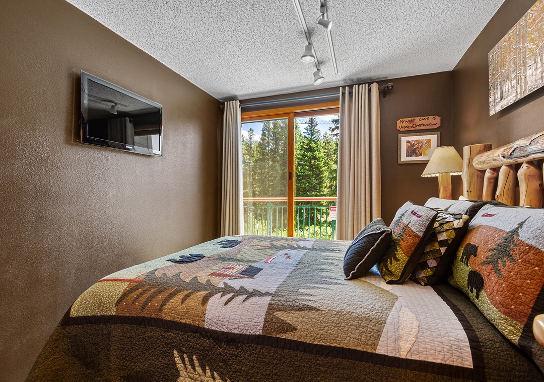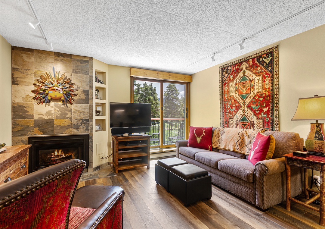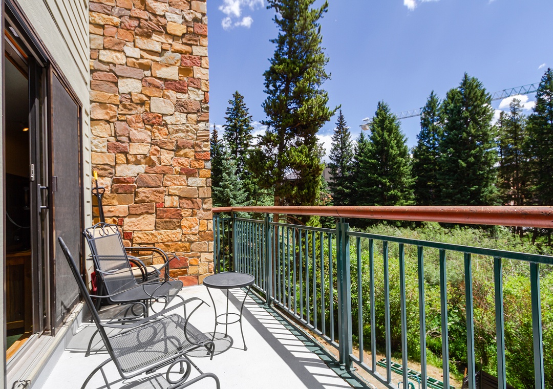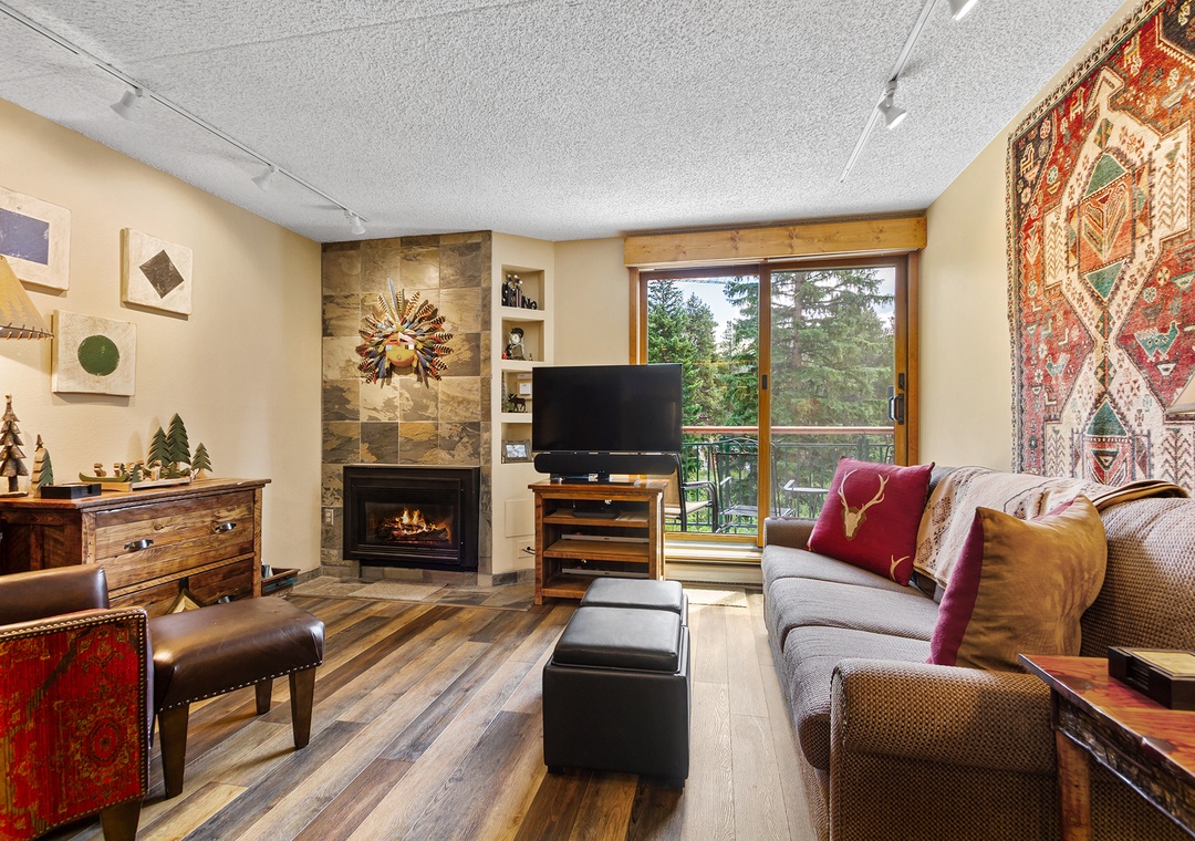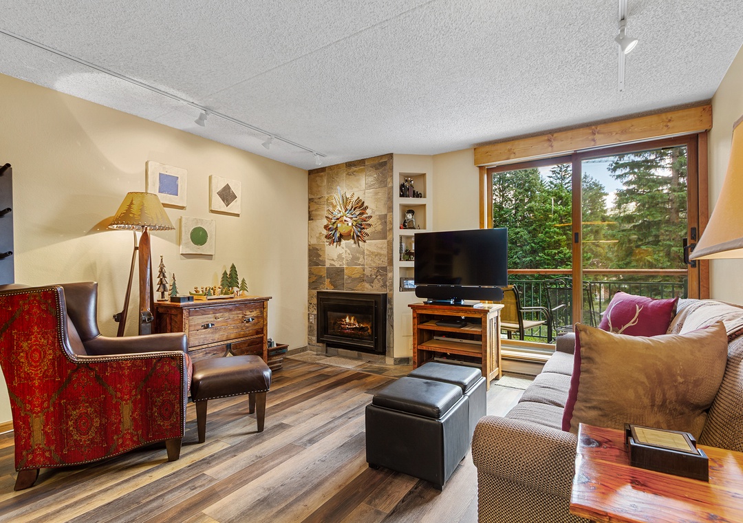 This beautiful one bedroom condo is updated annually, making it one of our nicest condos at Trails End. It's located just steps away from the Quicksilver lift and base of Peak 9. Easily walk the two blocks to Main Street Breckenridge for shopping, dining, and nightlife. The balcony offers a wooded view and a creek running in between. New features in this unit include a wonderful gas fireplace, remodeled kitchen with stainless steel appliances. Guests enjoy the new flat screen TV with HD programming as well. After a day on the slopes or trails relax in the indoor/outdoor hot tubs and sauna on site. Or enjoy the outdoor pool and indoor/outdoor hot tubs across the street. Check the snow report and stay connected with free Wi-Fi. Laundry access is also included with your stay at Trails End.
