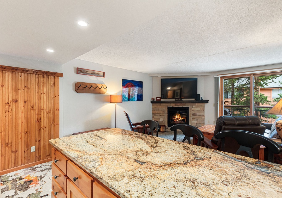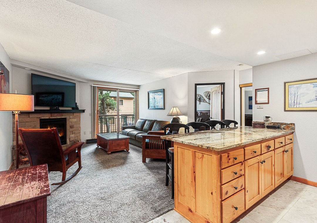 Come and experience one of our nicest remodeled Trails End one bedroom properties. This deluxe property is steps from the Quicksilver lift at the base of Peak 9 and two blocks to historic Main Street Breckenridge. This third floor property, accessed by central elevator, has been recently completely remodeled, has a king bed in the bedroom, and offers contemporary mountain furnishings for a cozy feel. The new ledger stone faced gas fireplace and leather couch makes for a very inviting property. Guests enjoy the wall mounted 65" flat screen TV. The private balcony is a nice benefit. After a day on the slopes or trails relax in the indoor/outdoor hot tubs and sauna on site. Or enjoy the outdoor pool and indoor/outdoor hot tubs across the street. Free Wi-Fi, and laundry access are also included with your stay at Trails End.