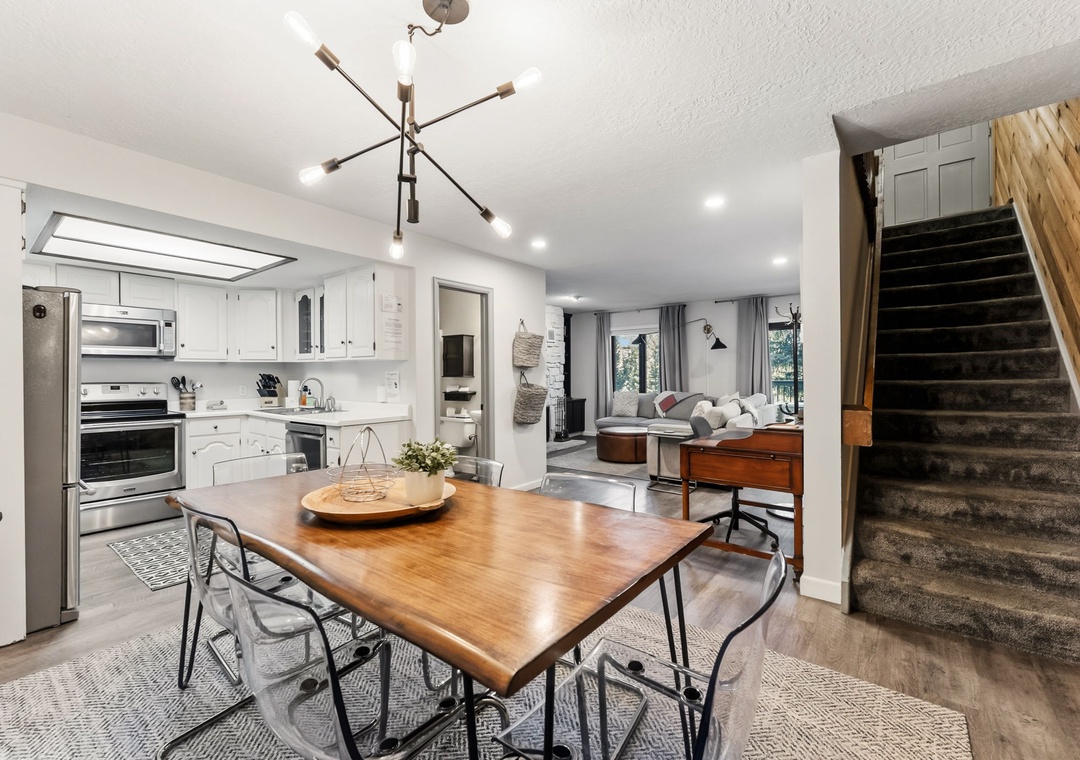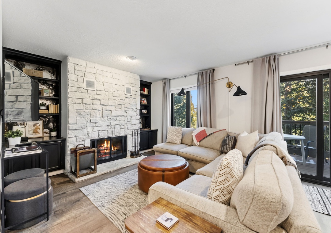 This welcoming mountain retreat at features an inviting open-concept living area complete with warm alpine décor, plush seating, and a wood fireplace ideal for unwinding after a day on the slopes. The fully equipped kitchen offers modern appliances, ample counter space, and everything you need for easy meal prep. Large windows draw in natural light and showcase the serene forest surroundings, while the private deck provides the perfect spot for morning coffee or après-ski relaxation. Guests will appreciate thoughtful touches throughout the home, including in-unit laundry, updated finishes, and a layout designed for comfort.