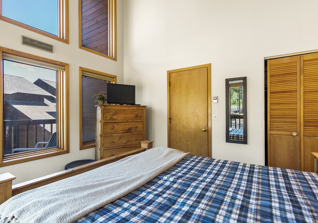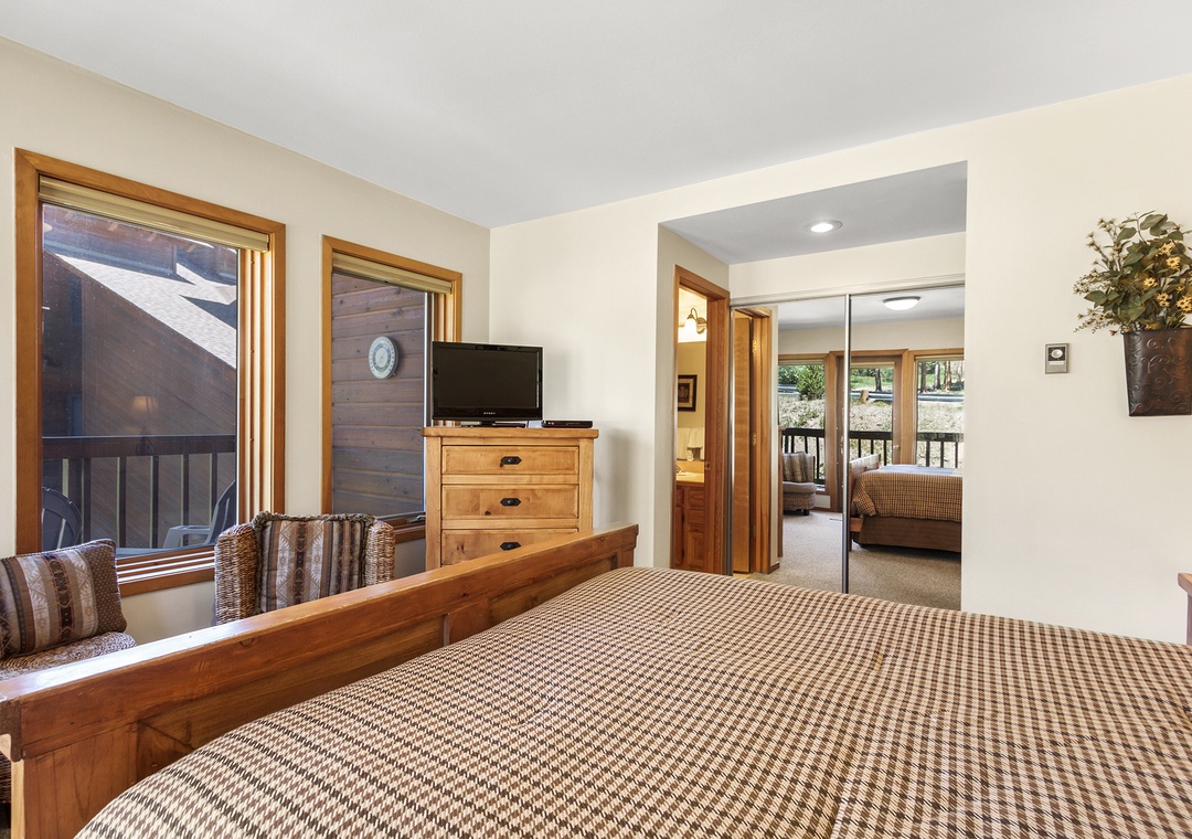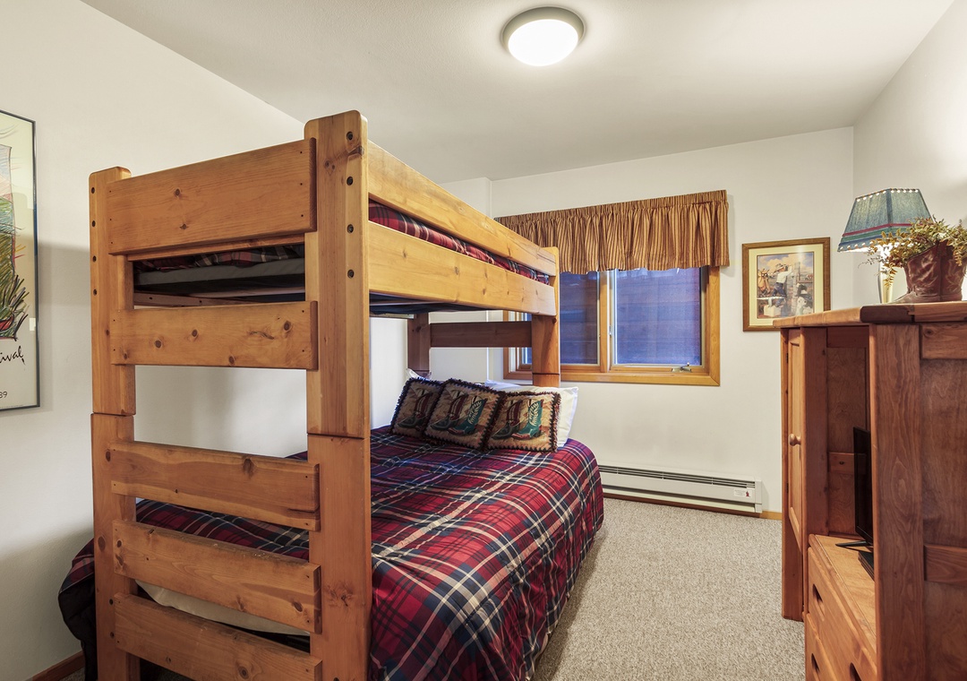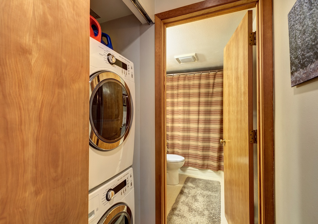 The first floor primary bedroom has a queen bed and en-suite bathroom. It also has a private balcony with Adirondack chairs that look North over towards the 4 O'clock Trail. Also on this floor is the bunk room that has its own flat screen TV for DVDs only. You can travel a little lighter, because Tyra Aspen 8 has its a private washer and dryer right off the second bedroom.