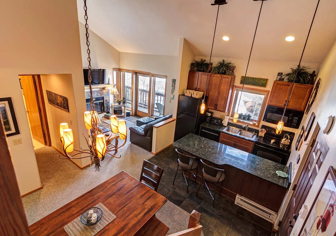 This is the perfect location for all seasons! The complex is located between the Snowflake and 4 O'clock Trails and just 4 blocks from downtown. Enjoy soaking in the on-site indoor and outdoor hot tubs. Or relax in front of the fireplace after a day of exploring. The open layout makes it easy for the whole family to be together. The dining area has seating for six, plus 2 bar seats, and the fully equipped kitchen has everything you need to prepare your favorite meals.