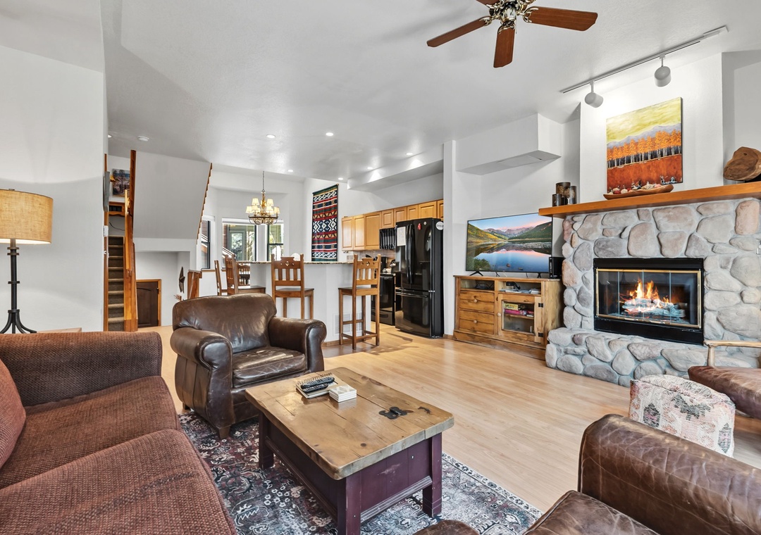 Inside, you'll find a spacious and inviting living area with rustic wood beams, plush seating, and a cozy gas fireplace—perfect for relaxing after a day on the slopes. The open-concept kitchen features granite countertops, stainless steel appliances, and everything you need to prepare meals at home. Whether you're cooking for the whole family or enjoying a quiet breakfast before hitting the trails, this space is fully equipped for your stay.