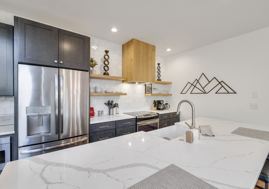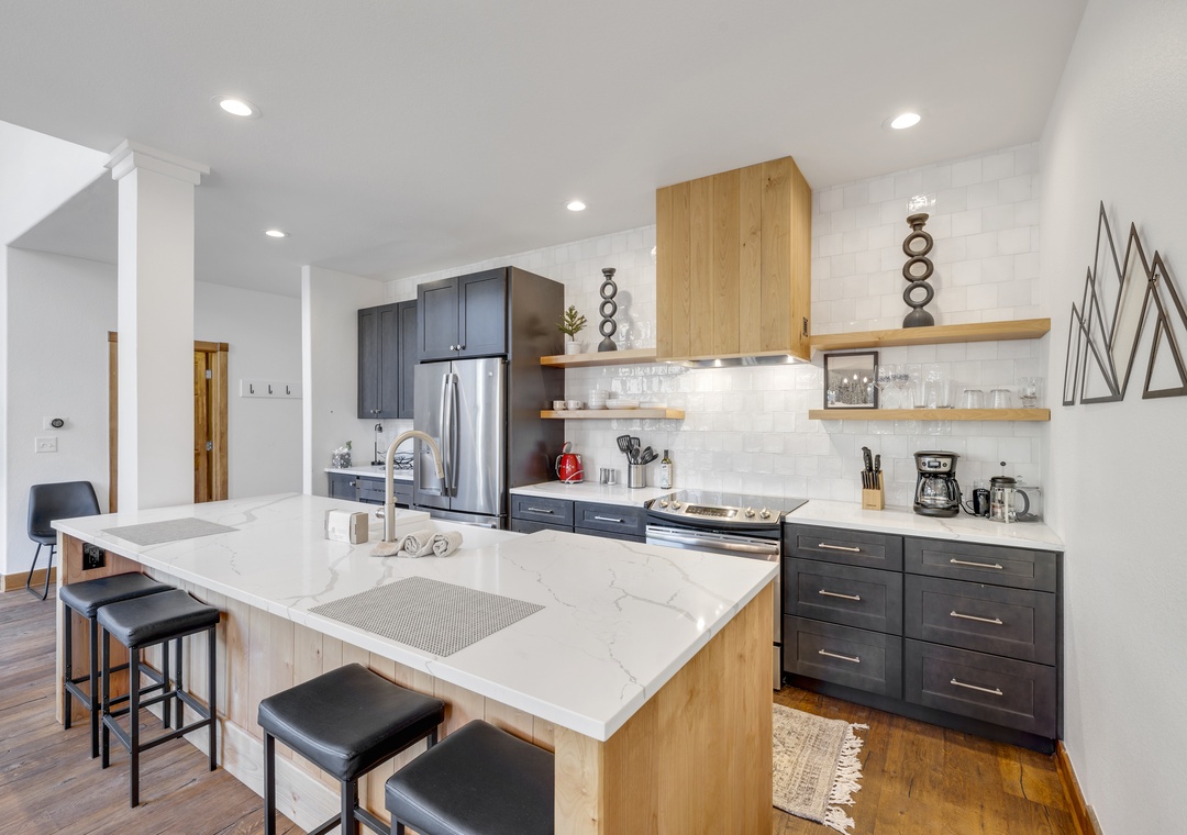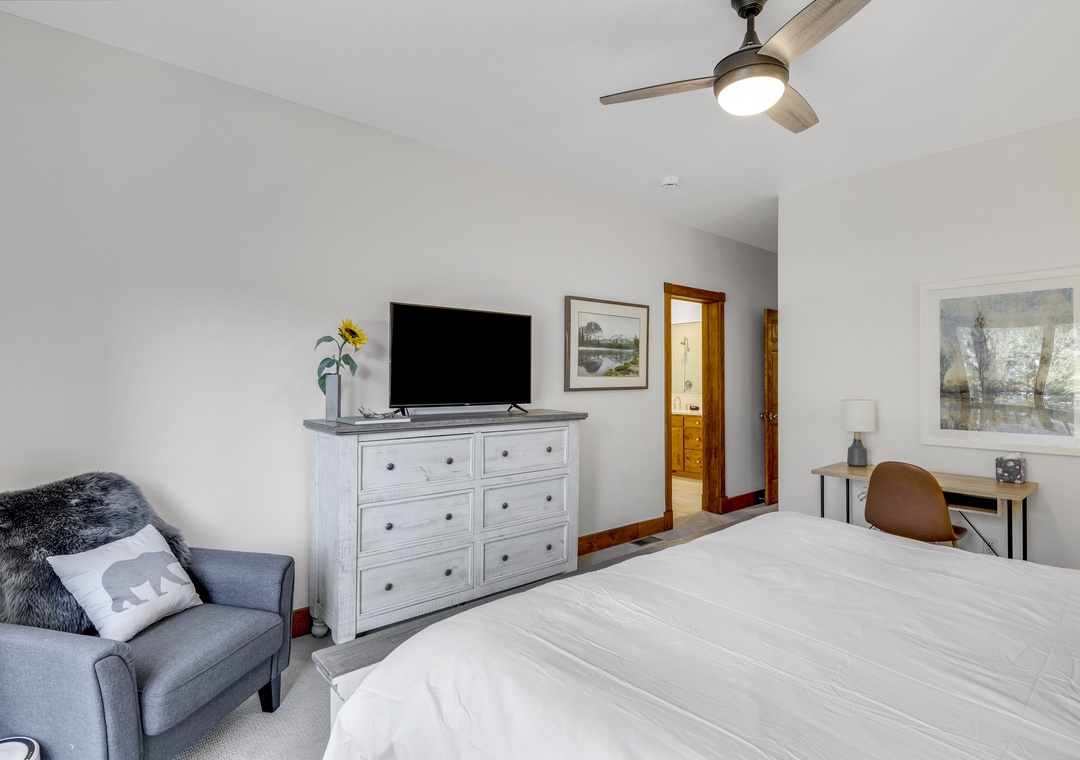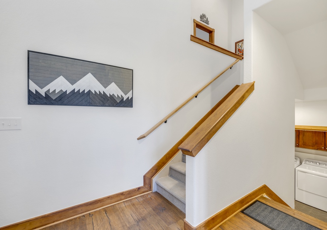 The primary suite features a plush king bed and a luxurious en-suite bathroom. Additional bedrooms offer flexible sleeping arrangements for families or groups, and the home comfortably sleeps up to twelve guests. You'll also enjoy modern conveniences like free Wi-Fi, smart TVs, an in-unit washer and dryer, and a two-car garage, perfect for storing your gear for all the adventures this beautiful place has to offer.