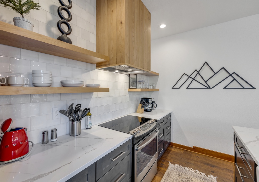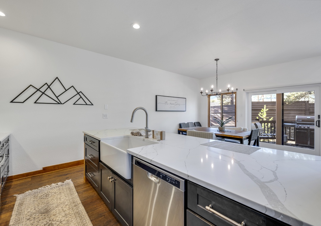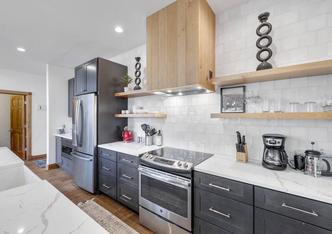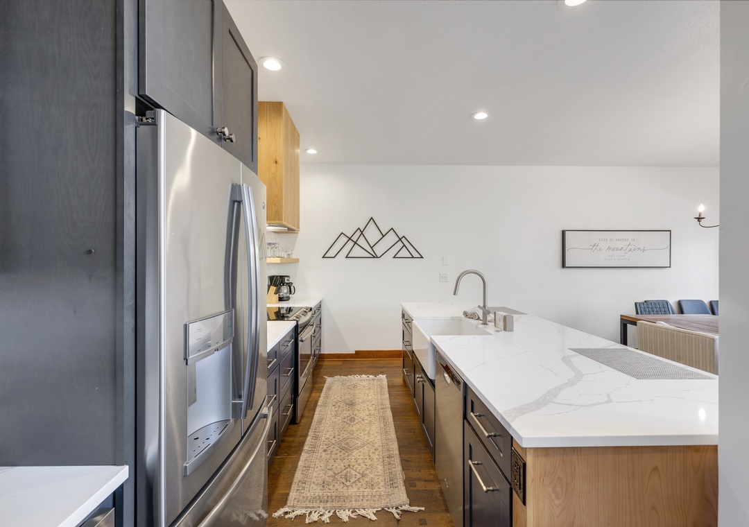 The primary suite features a plush king bed and a luxurious en-suite bathroom. Additional bedrooms offer flexible sleeping arrangements for families or groups, and the home comfortably sleeps up to twelve guests. You'll also enjoy modern conveniences like free Wi-Fi, smart TVs, an in-unit washer and dryer, and a two-car garage, perfect for storing your gear for all the adventures this beautiful place has to offer.