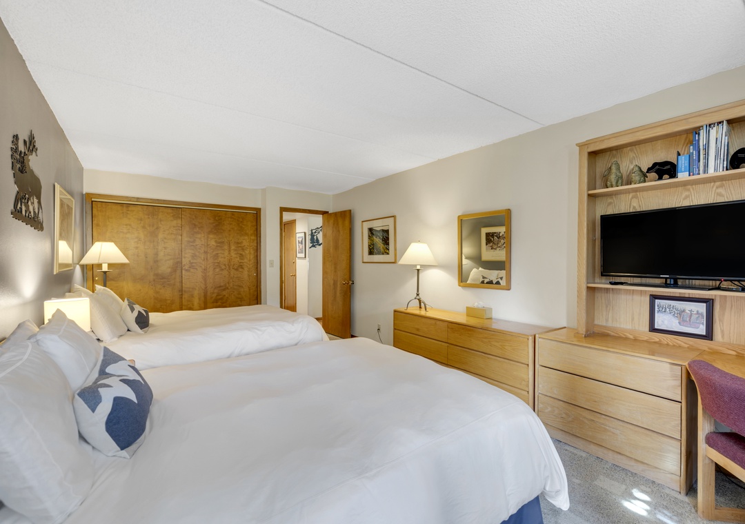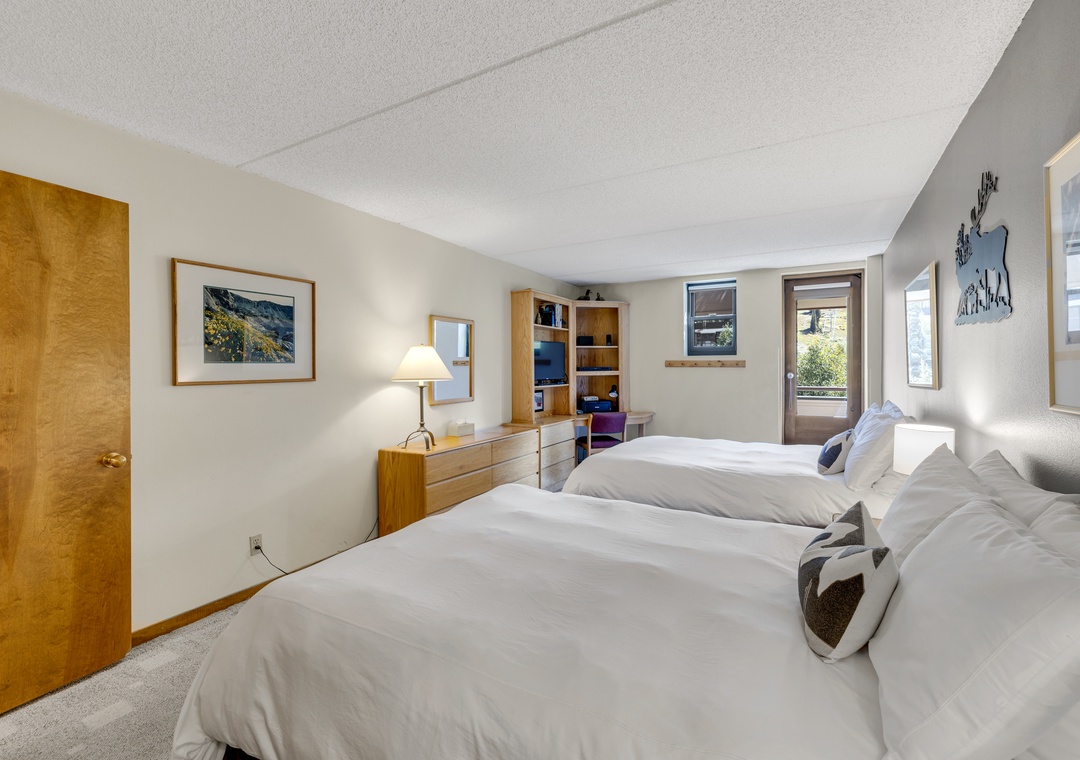 Amenities include two large TVs (with cable and streaming options), high-speed Wi-Fi throughout the condo complex, a desk with printer for those mixing work and play, and a secure ski locker on the first floor for easy storage. Guests can also enjoy access to the community hot tub, fitness room, sauna and laundry facilities.