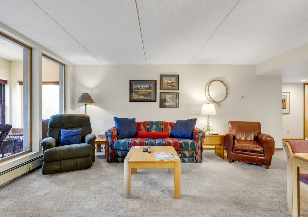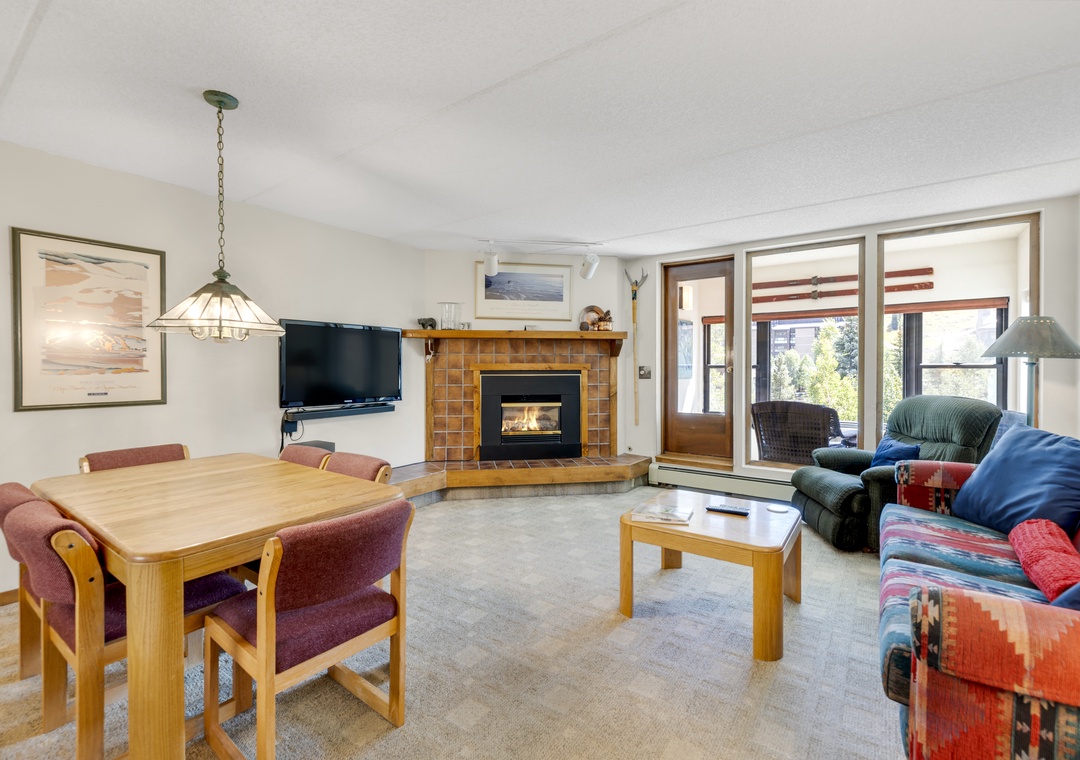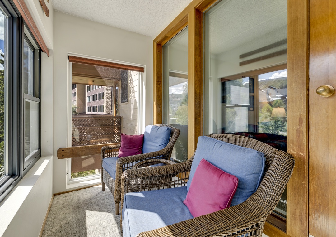 The great room opens into a bright enclosed sunroom with huge mountain views, the perfect spot to watch the activity in Center Village with the Rockies as your backdrop. In addition, off of the bedroom there is a private exterior porch that lets you breathe in the crisp alpine air.
