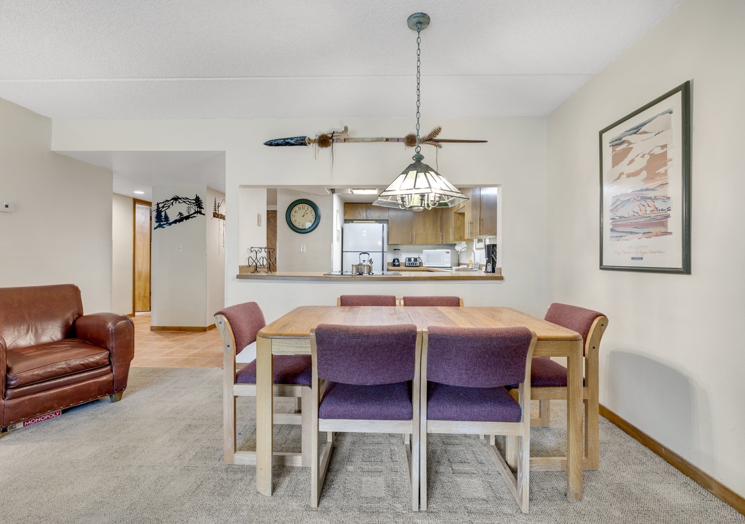 The full kitchen is equipped with everything you need, from small appliances (coffee maker, crock pot, microwave, and more) to plenty of cookware for preparing anything from a big dinner to a quick breakfast. The dining table seats six comfortably.