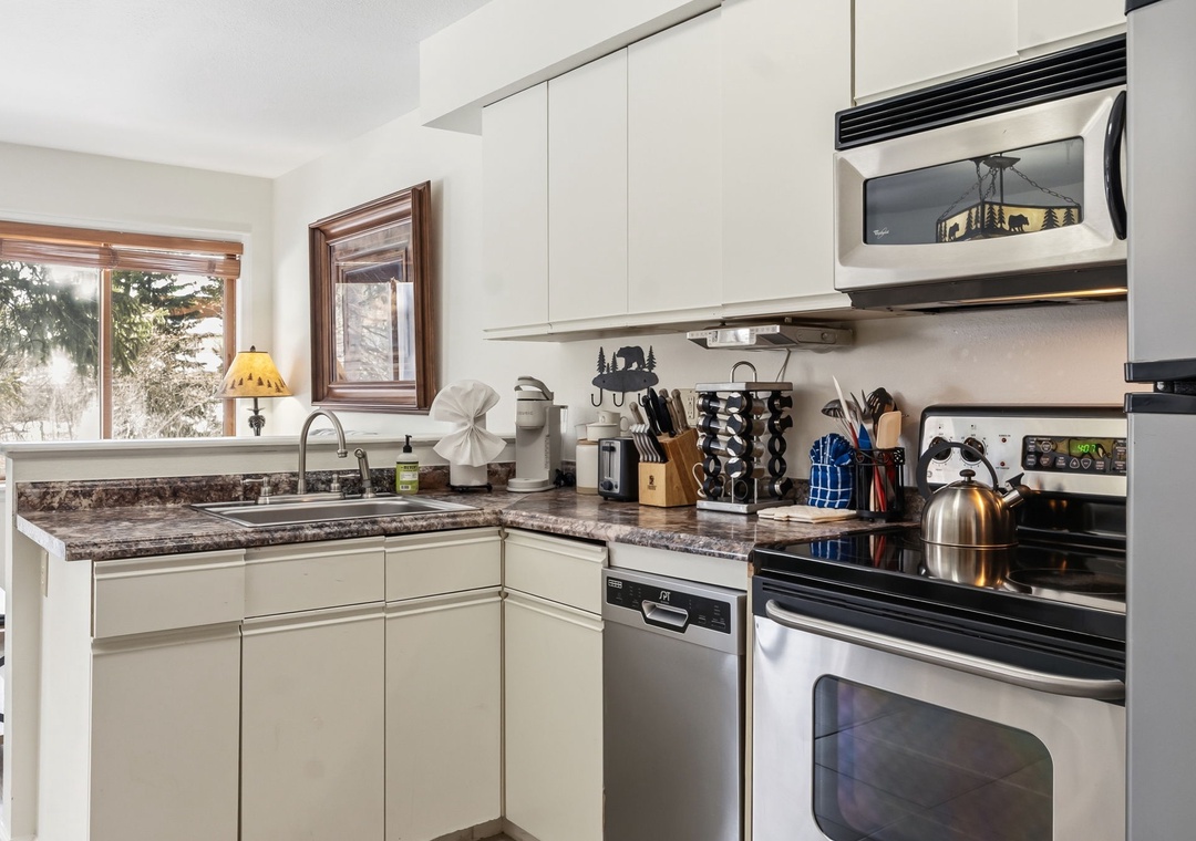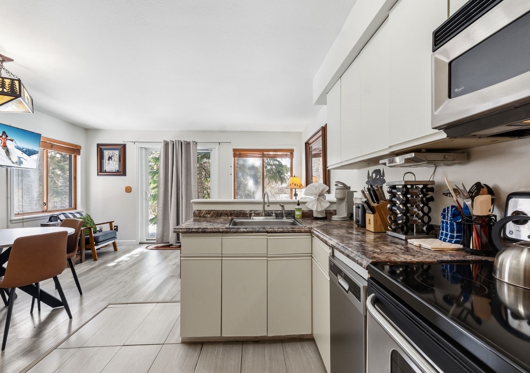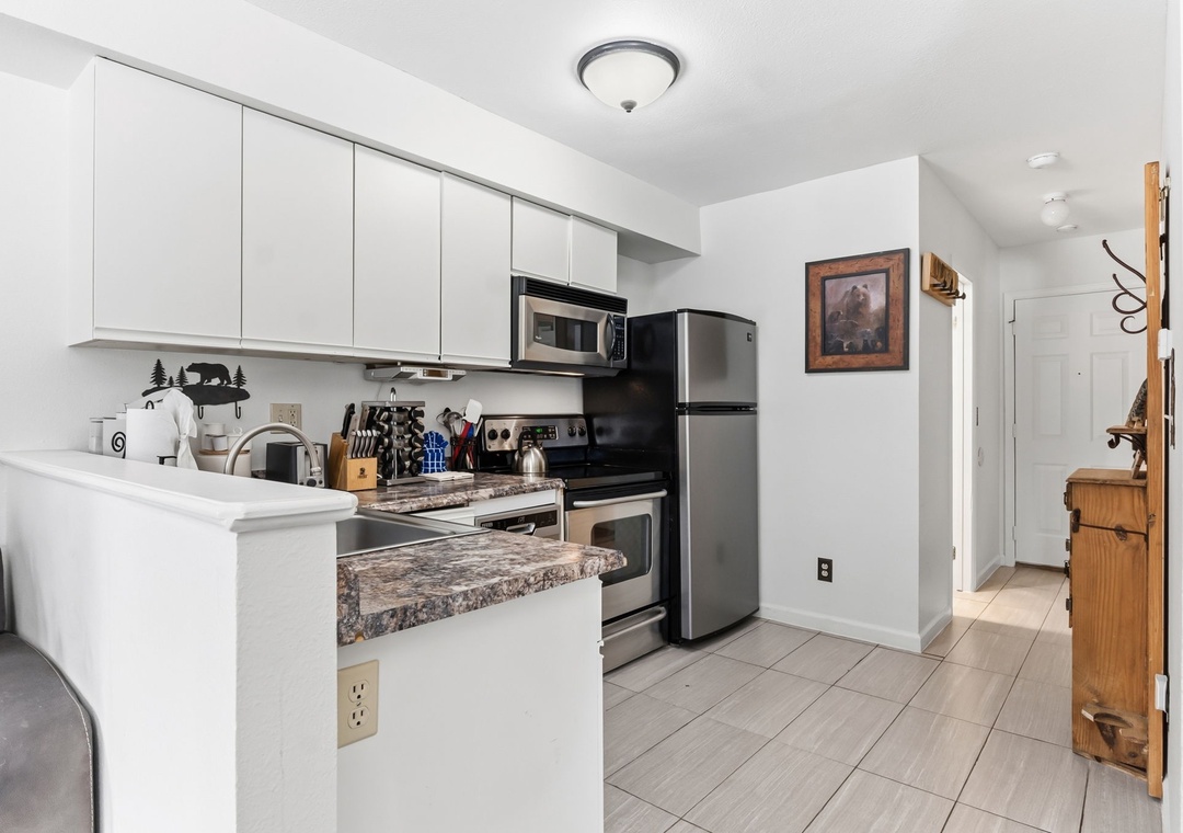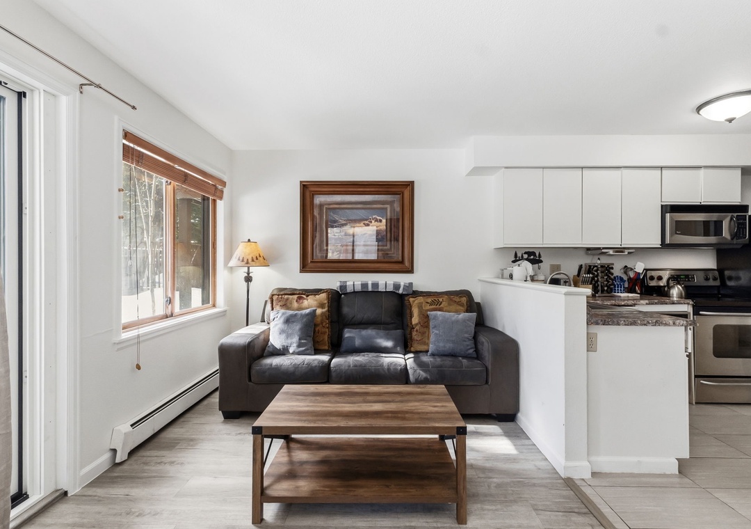 Inside, the condo was recently refreshed with updated furnishings and thoughtful touches throughout, creating a clean and inviting mountain retreat. The living area includes a queen sofa sleeper, allowing the space to comfortably accommodate up to four guests. A fully equipped kitchen—stocked with coffee—makes mornings easy, whether you’re heading out early or enjoying a slow start to the day. After your adventures, unwind on the private deck overlooking a tranquil stream or settle in for a cozy evening indoors.
