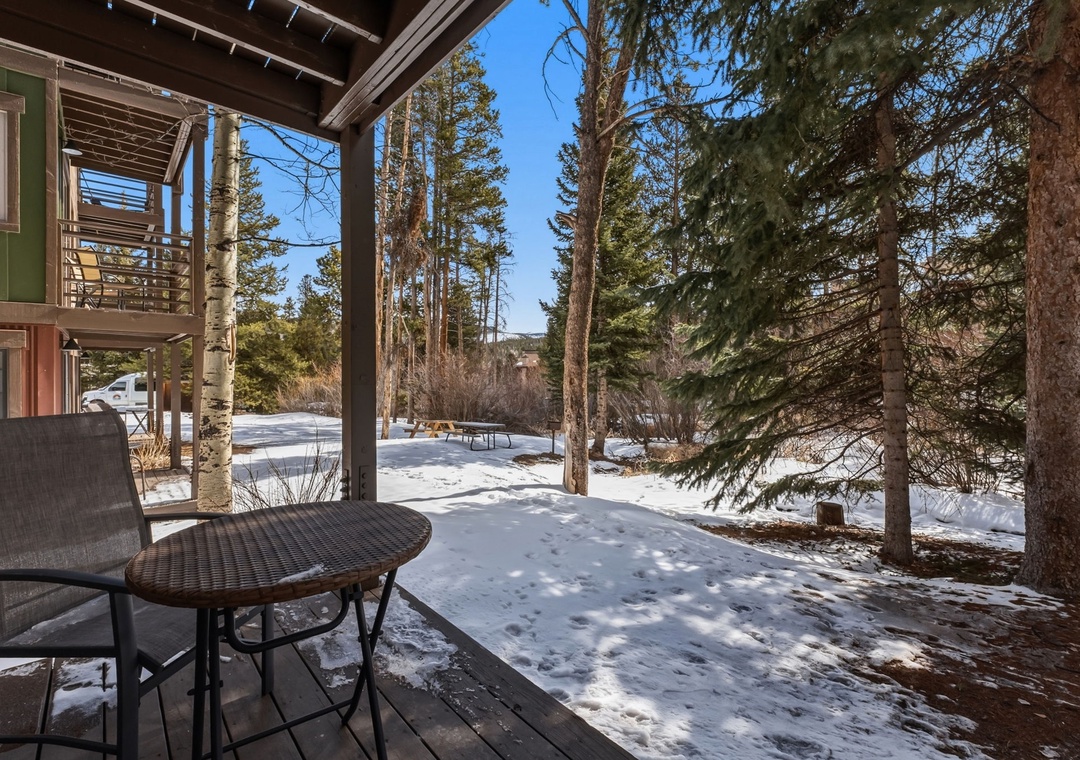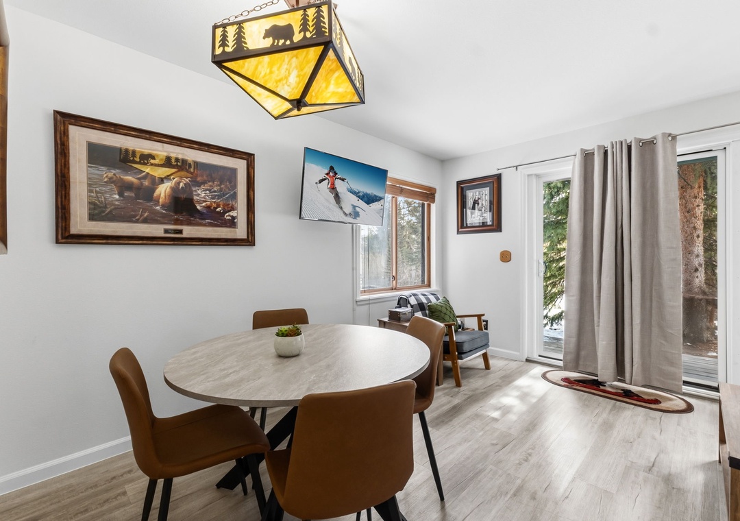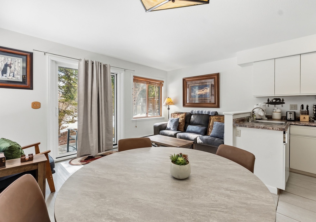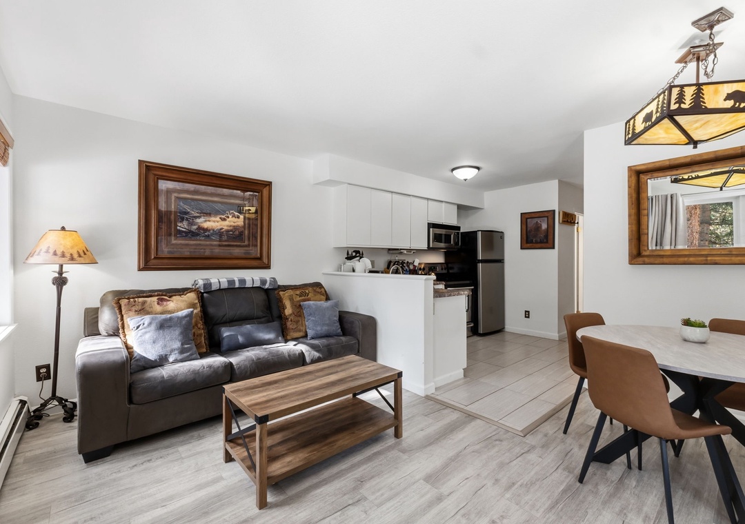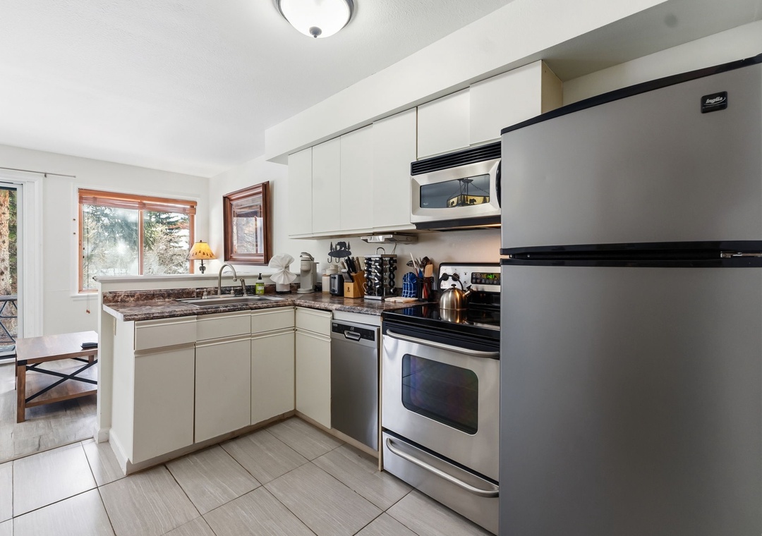 Inside, the condo was recently refreshed with updated furnishings and thoughtful touches throughout, creating a clean and inviting mountain retreat. The living area includes a queen sofa sleeper, allowing the space to comfortably accommodate up to four guests. A fully equipped kitchen—stocked with coffee—makes mornings easy, whether you’re heading out early or enjoying a slow start to the day. After your adventures, unwind on the private deck overlooking a tranquil stream or settle in for a cozy evening indoors.