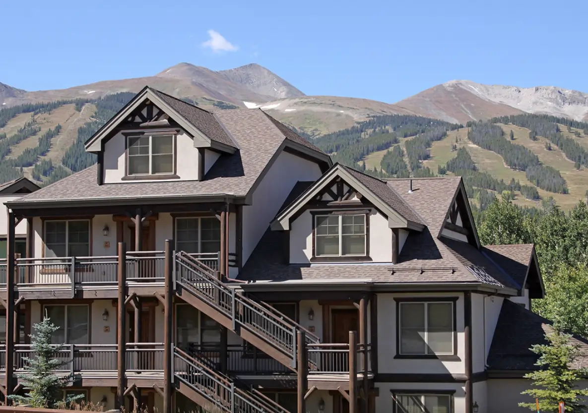 South Main Street Breckenridge location | 1–4 bedroom condos | Western-style decor with 9' ceilings | Full kitchens with modern appliances | Gas fireplaces | Private decks or patios, some with private hot tubs | Mountain and town views (varies by unit) | Detached garages or large private ski lockers (varies by unit) | Elevators in each building | Oversized outdoor community hot tubs | 2 fitness centers | Sauna / steam or dry rock sauna | Game room with pool table, foosball, air hockey, and big-screen TV | Business center and lounge areas | Central laundry in complex plus in-unit laundry in some condos | 5–10 minute walk to Quicksilver lift at Peak 9
