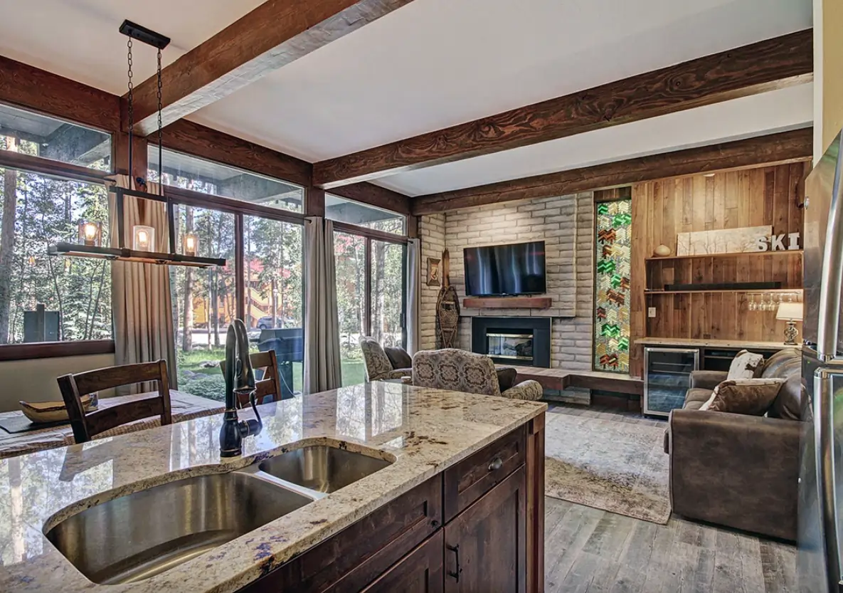 1–3 bedroom condos (mostly 2–3BR) | Full kitchens | Open living and dining areas | Brick-accent gas or wood-burning fireplaces (varies by condo) | Private balconies | Tenmile Range, forest, or neighborhood views (many condos) | Free Wi‑Fi | TVs | Central/shared laundry | Surface parking | Columbine/Four Seasons pool & clubhouse access | Outdoor heated pool | Multiple indoor/outdoor hot tubs | On or near Breck Free Ride bus route | Columbine Loop/Warriors Mark location | 5-minute walk to Quicksilver Lift & ski school at Peak 9 | 2 blocks to Main Street shops, restaurants & nightlife | Near Riverwalk Center, Illinois Gulch open space & National Forest trails